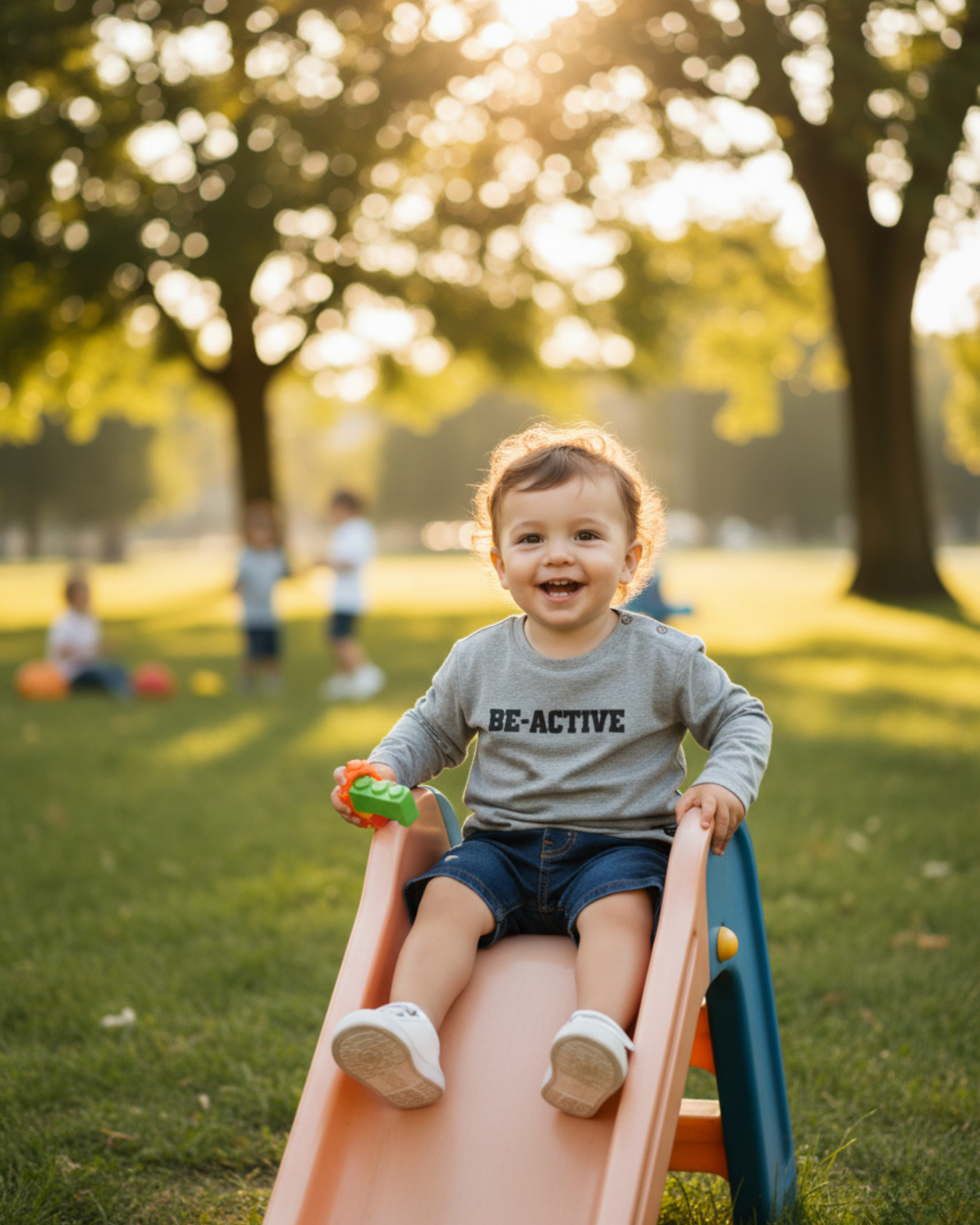Camiseta de manga larga en color gris jaspeado, con el mensaje "BE-ACTIVE" estampado en negro en el centro del pecho. De corte clásico, incluye botones de presión en el hombro para facilitar el vestido y una pequeña etiqueta de marca en el bajo.