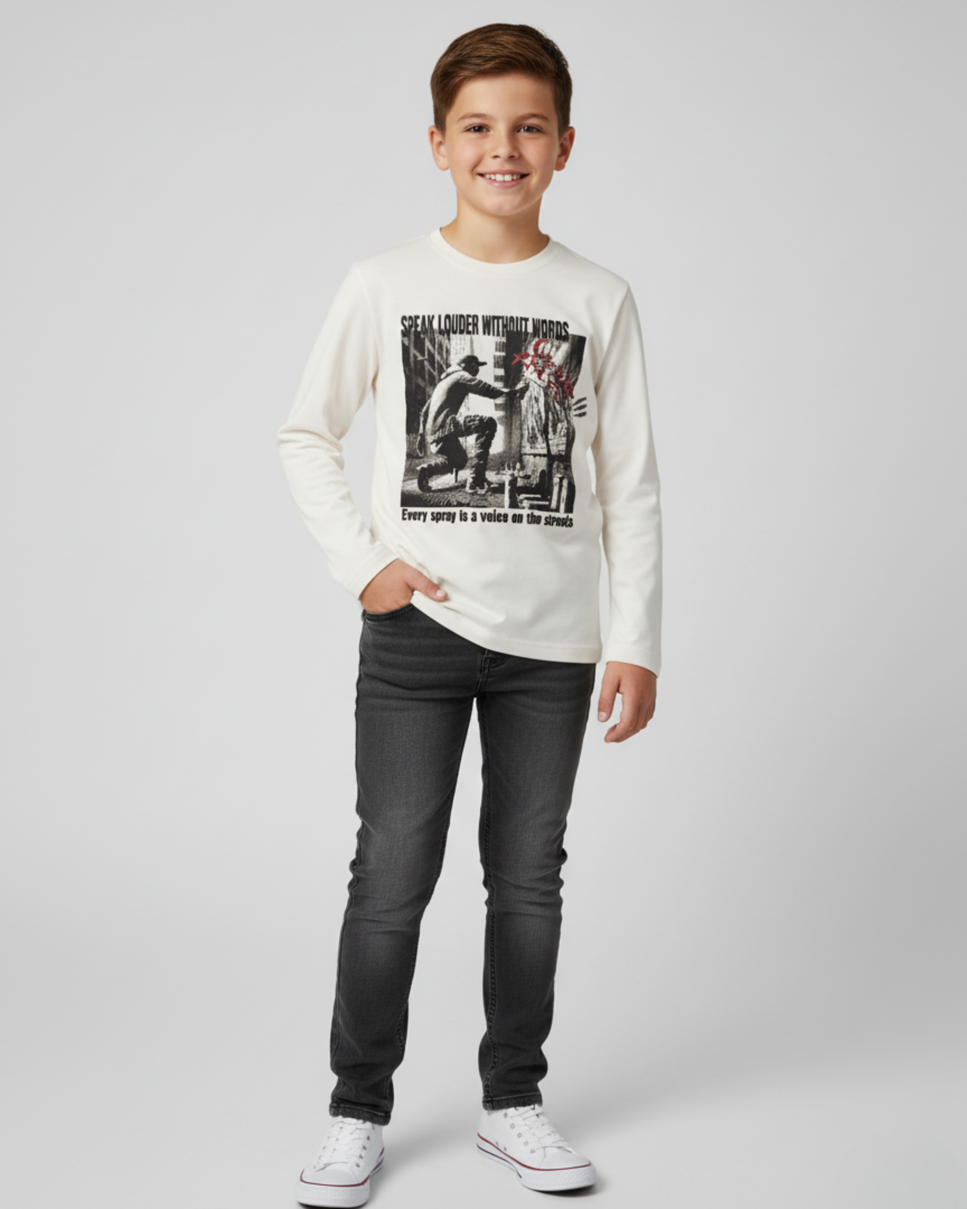 Con un diseño que evoca el arte callejero y el street style, esta camiseta de manga larga es ideal para quienes quieren expresar su actitud. El estampado en blanco y negro incluye el potente mensaje en inglés: "Speak louder without words" (Habla más fuerte sin palabras) y "Every spray is a voice on the streets" (Cada aerosol es una voz en las calles). Perfecta para un look casual y con personalidad.