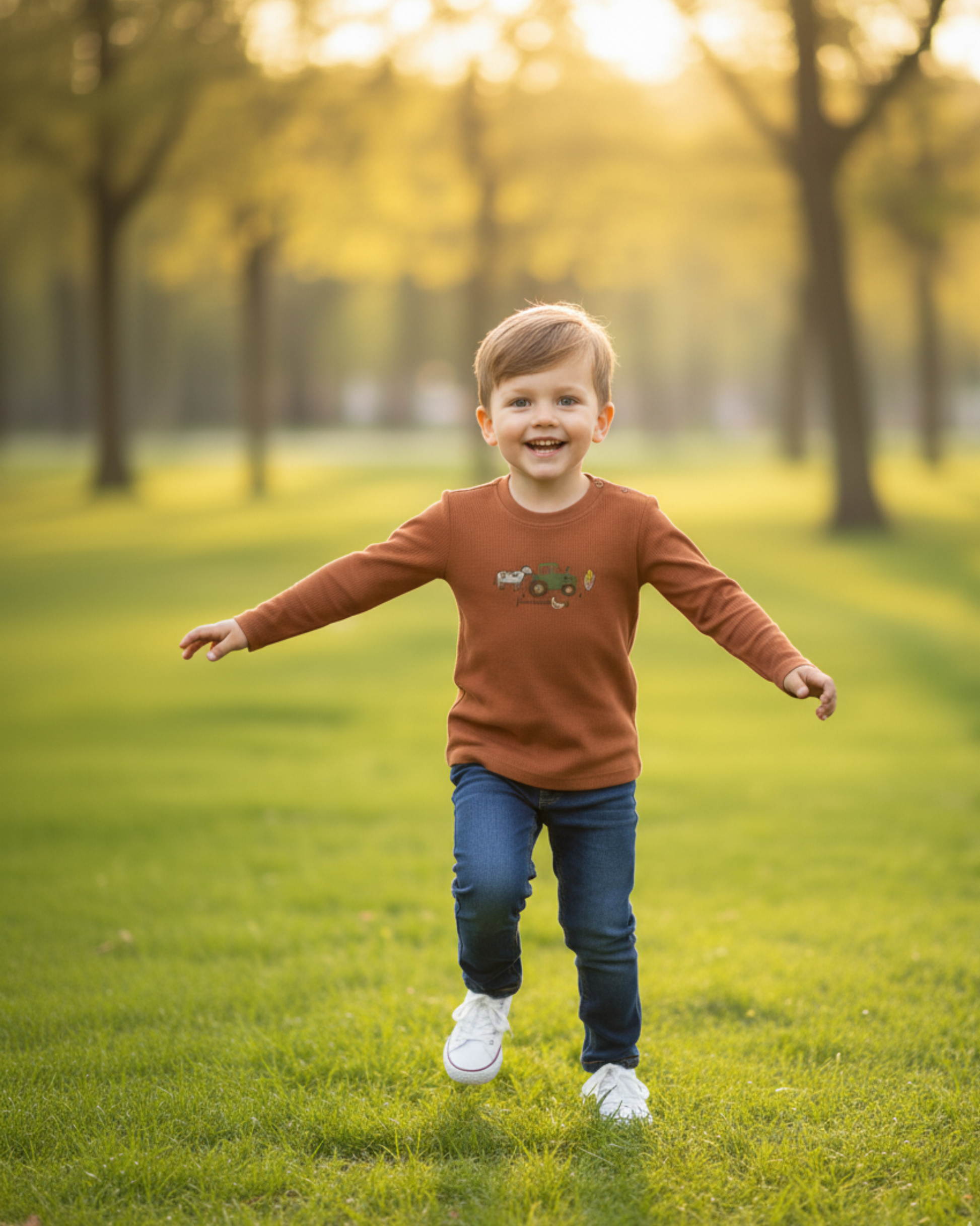 Camiseta de manga larga en color marrón terracota, con un pequeño estampado lateral con motivos de granja. Es una prenda ecológica, certificada con el sello GOTS (Global Organic Textile Standard), y cuenta con botones de seguridad en el hombro para una mayor comodidad al vestir.