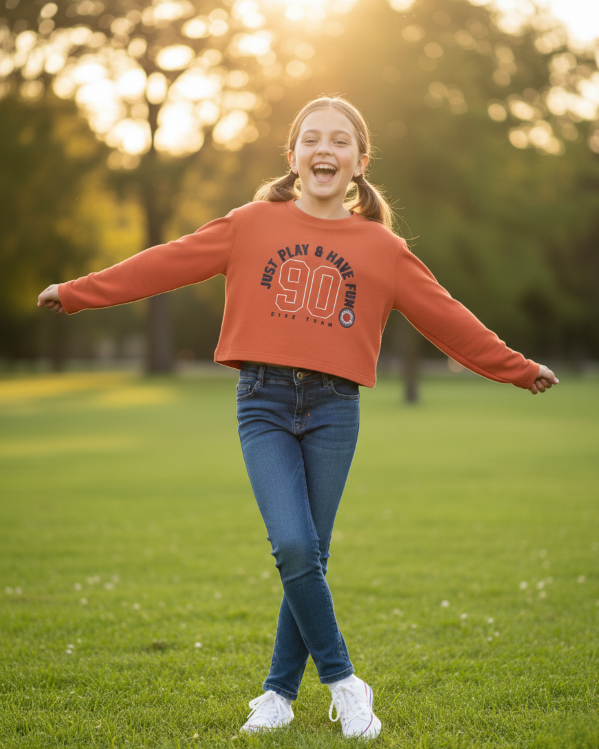 Camiseta de manga larga en un vibrante color naranja rojizo con un estampado frontal de inspiración deportiva. El diseño incluye el número "90" y el mensaje "JUST PLAY & HAVE FUN" (Solo juega y diviértete). Ideal para un look enérgico y casual.