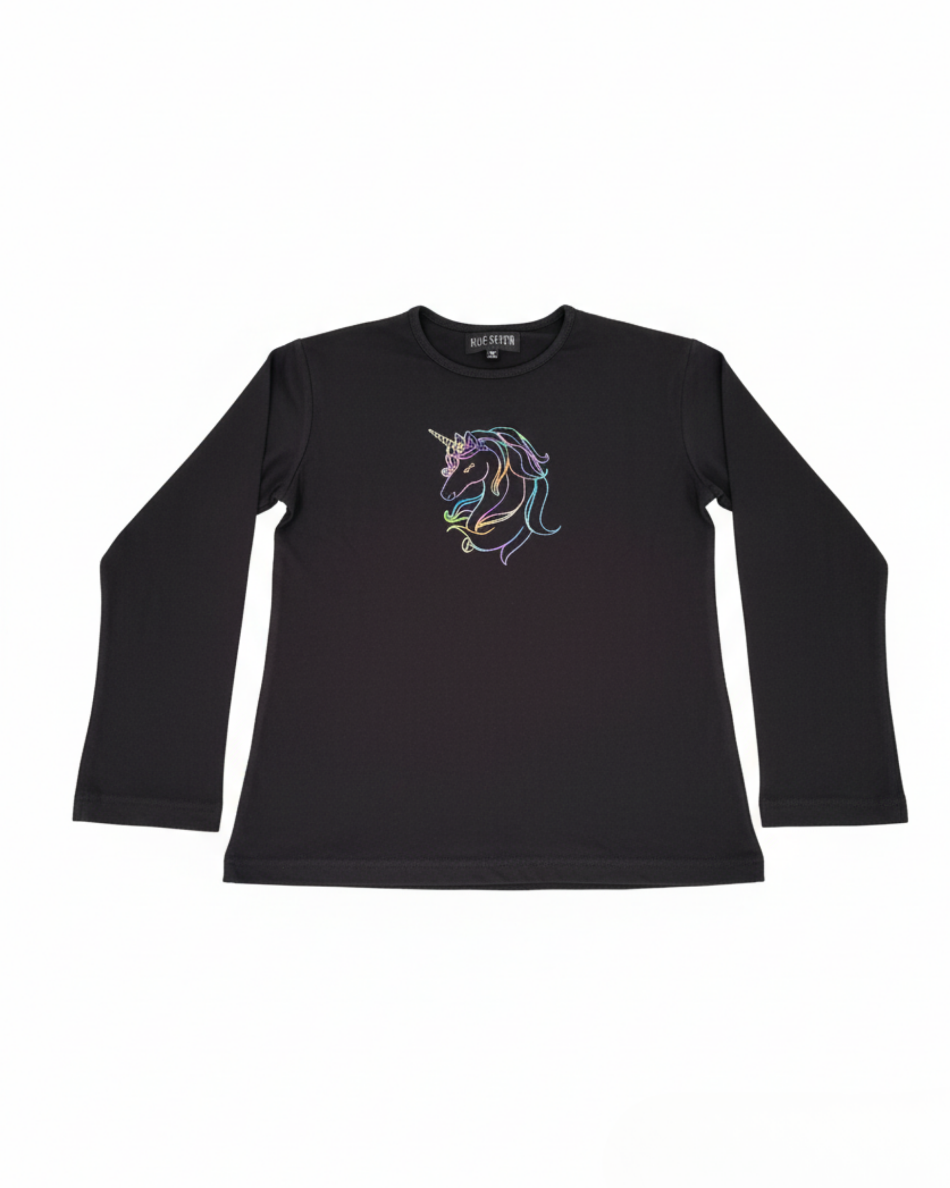 Camiseta de manga larga en color azul marino, con un llamativo estampado de un unicornio en colores iridiscentes/arcoíris. De corte liso, es ideal para un look casual con un toque mágico y moderno.