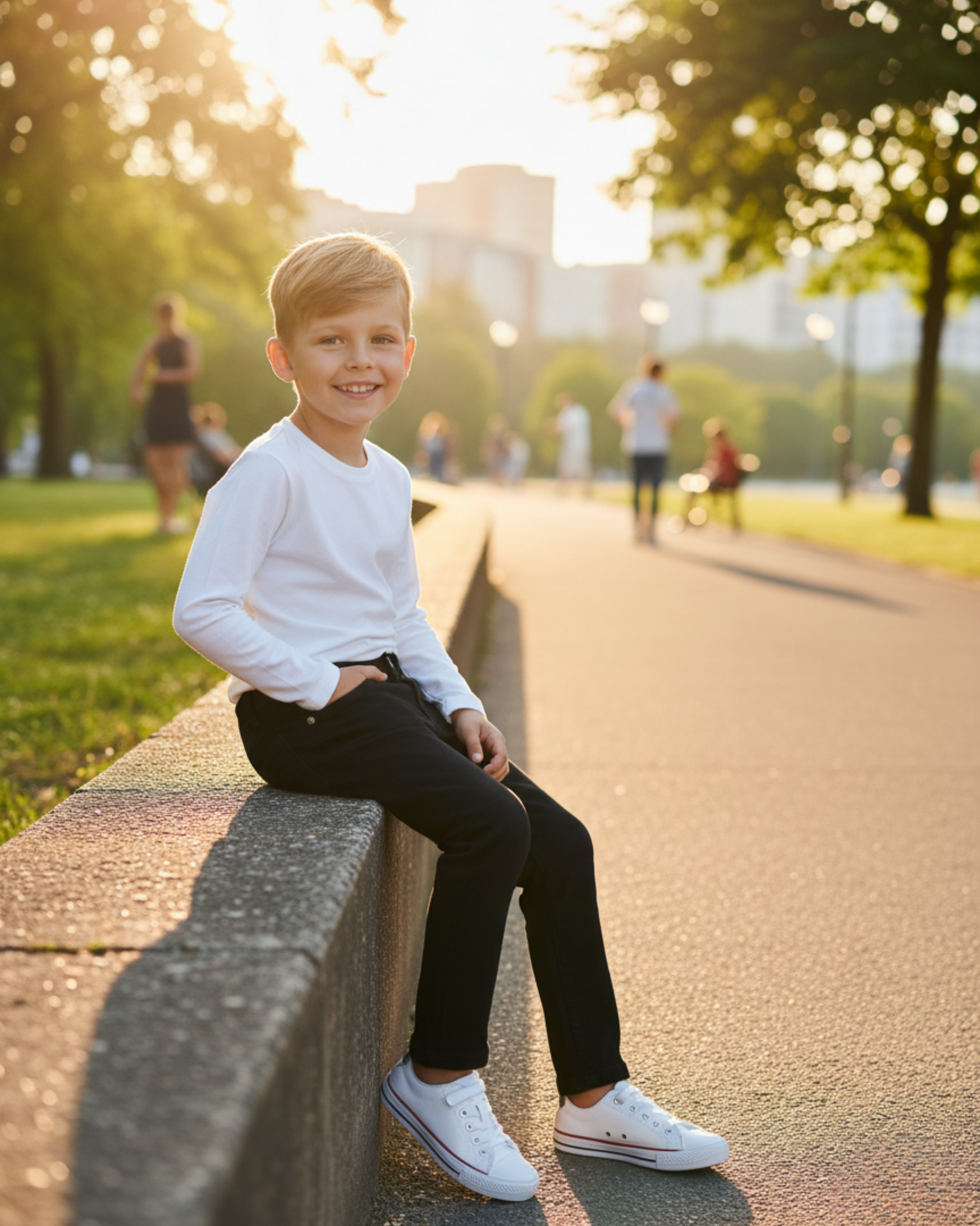 Pantalón de bebé tipo vaquero en color negro liso. Presenta un corte recto y un estilo clásico de cinco bolsillos. Incluye cierre de botón a presión y cremallera, ideal para un look casual y versátil.