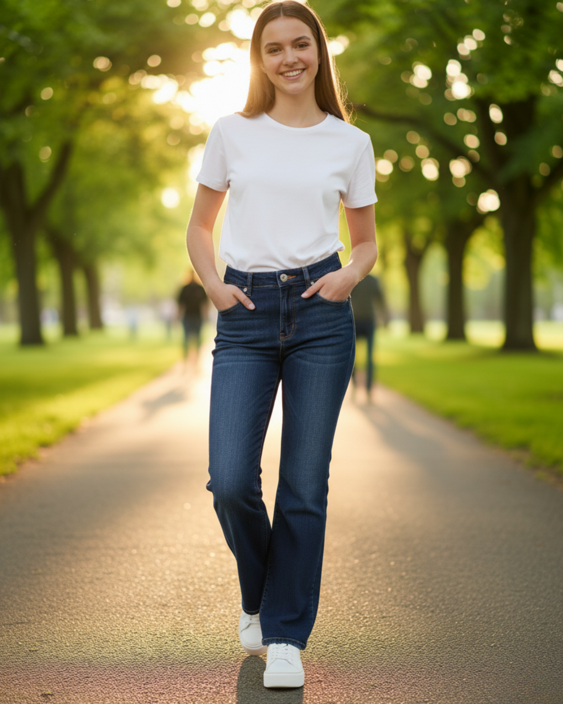 Pantalón vaquero de niña en tono azul. Presenta un corte recto/clásico con un ligero efecto de lavado en los muslos y el estilo tradicional de cinco bolsillos.