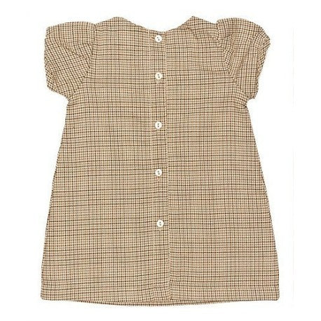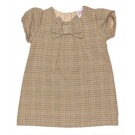 Este es un vestido de corte trapecio para niña con manga corta abullonada. Está confeccionado en un tejido con un patrón de cuadros pequeños o espiga (tipo Príncipe de Gales) en tonos beige, marrón y negro. El cuello es redondo y la parte frontal superior está adornada con un gran lazo de tela y pequeños pliegues. Para un look de invierno formal, combínalo con una chaqueta de punto lisa de color marrón chocolate o burdeos, leotardos de lana en tono crudo o beige y botines de charol oscuros.