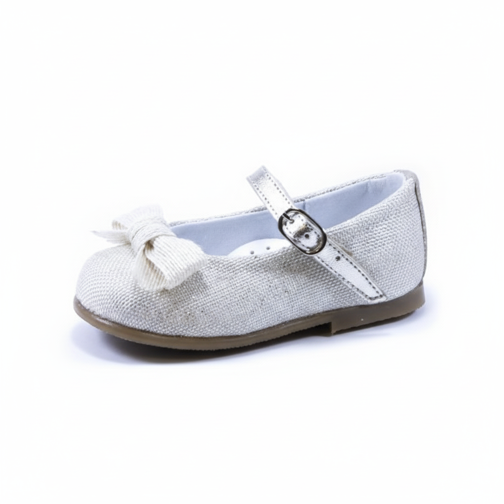 Esta bailarina es la elección ideal para añadir un toque de brillo y festividad al calzado de las más pequeñas. El zapato está confeccionado en un tejido con hilo metalizado plateado que captura la luz, y se adorna con un delicado lazo de tela grosgrain en la puntera. Cuenta con un cierre de pulsera con hebilla para asegurar un ajuste firme. Perfectas para eventos y fiestas, combínalas con el vestido de punto para un look invernal, o con el pantalón chino negro y una blusa para una celebración elegante.