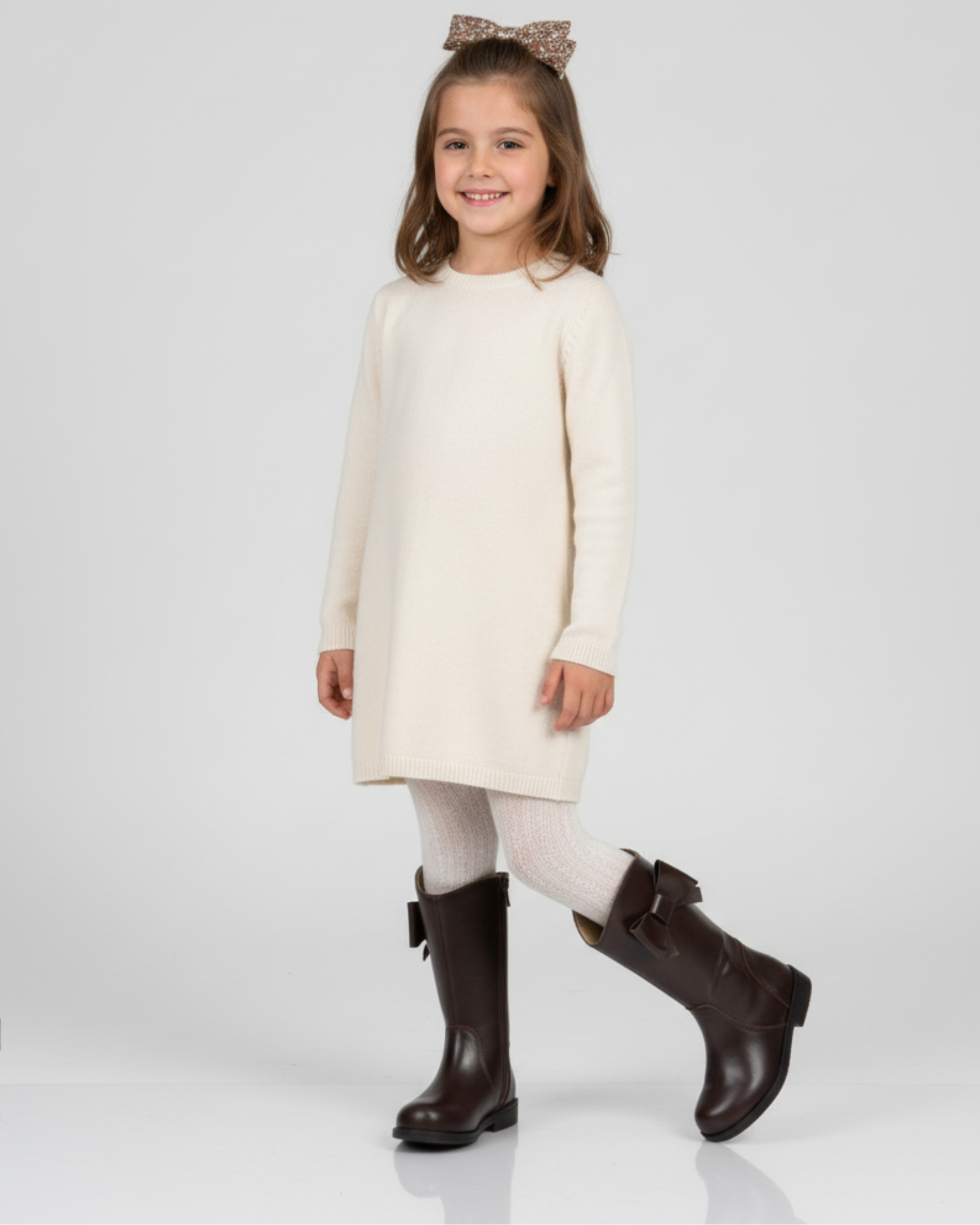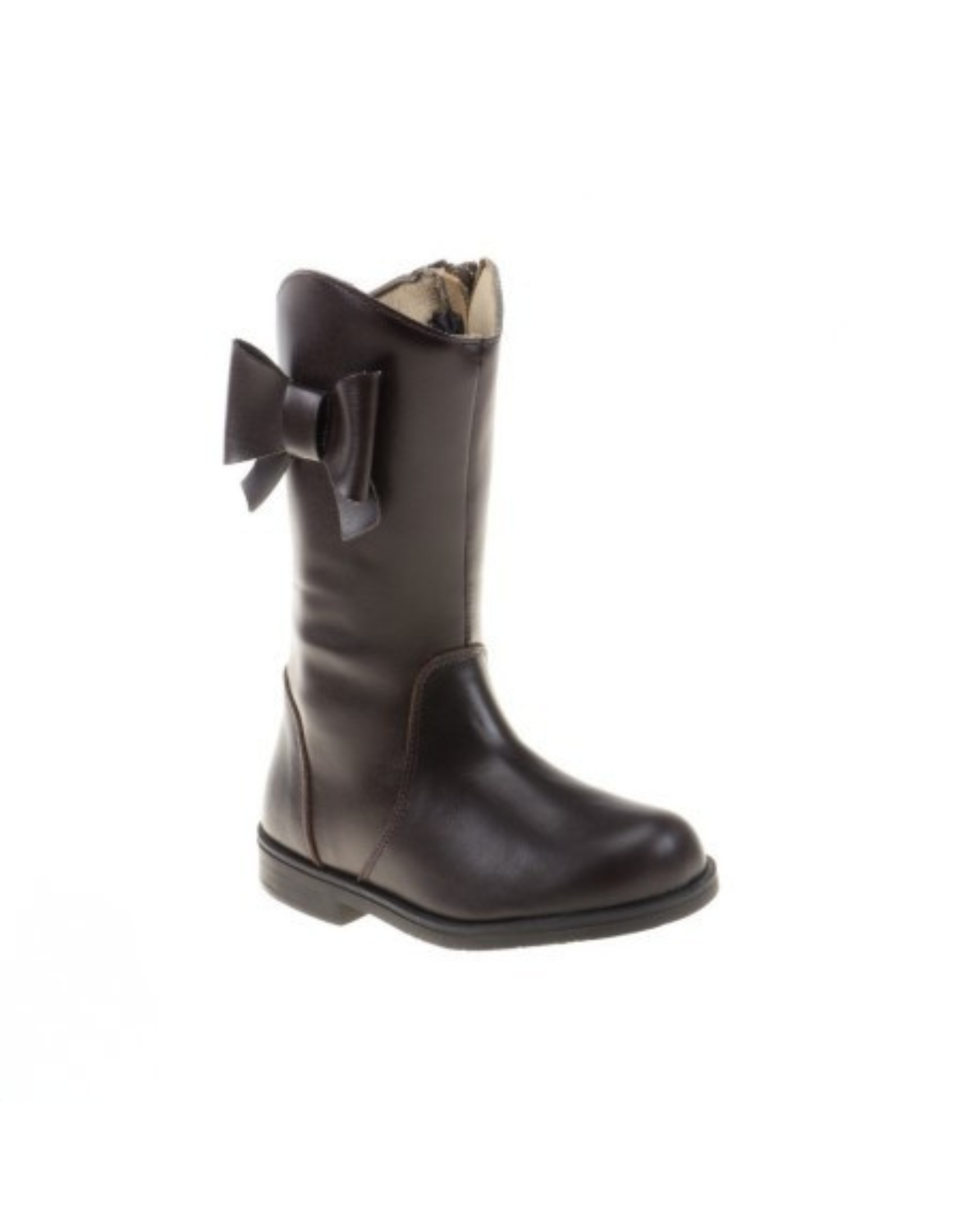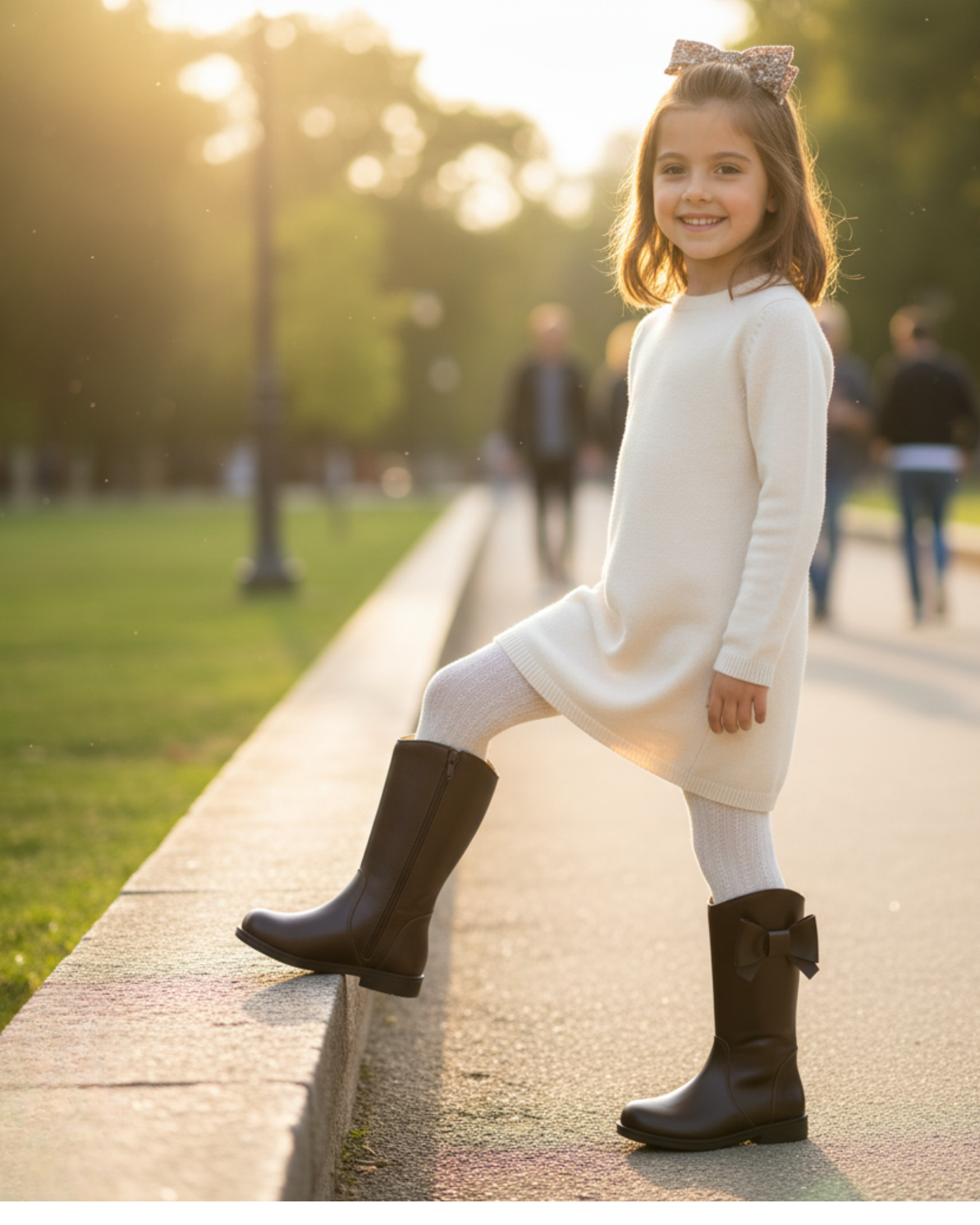 Esta bota de caña media-alta en color marrón chocolate es la opción perfecta para mantener los pies abrigados con un toque de dulzura. Con un diseño clásico y estructura firme, el detalle más encantador es el lazo de polipiel adornando la parte trasera. Incorpora un cierre de cremallera lateral que facilita el calce rápido y cómodo. Para un look de invierno encantador, combínalas con un vestido de punto, leggings térmicos y un abrigo a juego, o con jeans metidos por dentro para un paseo elegante.