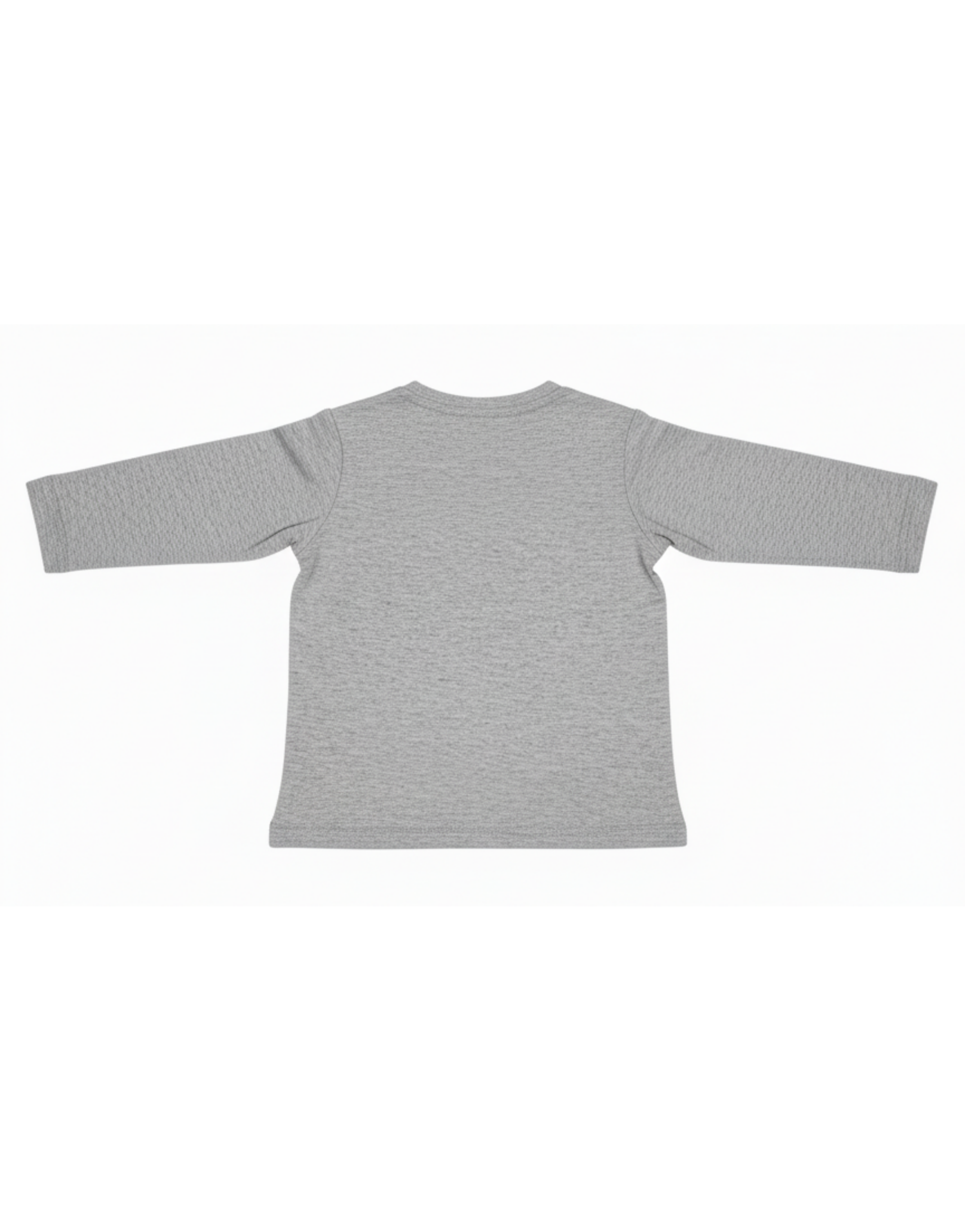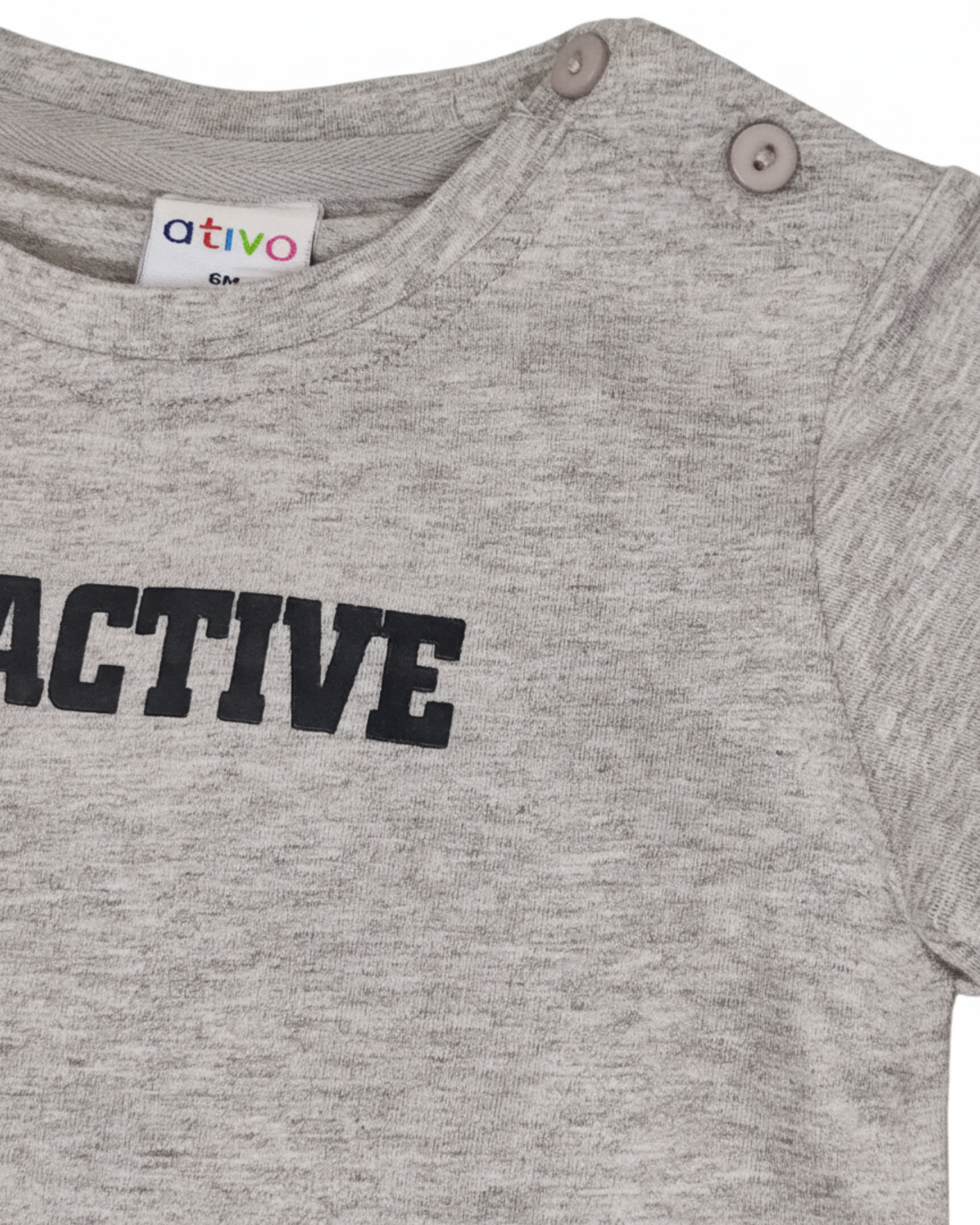 Camiseta de manga larga en color gris jaspeado, con el mensaje "BE-ACTIVE" estampado en negro en el centro del pecho. De corte clásico, incluye botones de presión en el hombro para facilitar el vestido y una pequeña etiqueta de marca en el bajo.