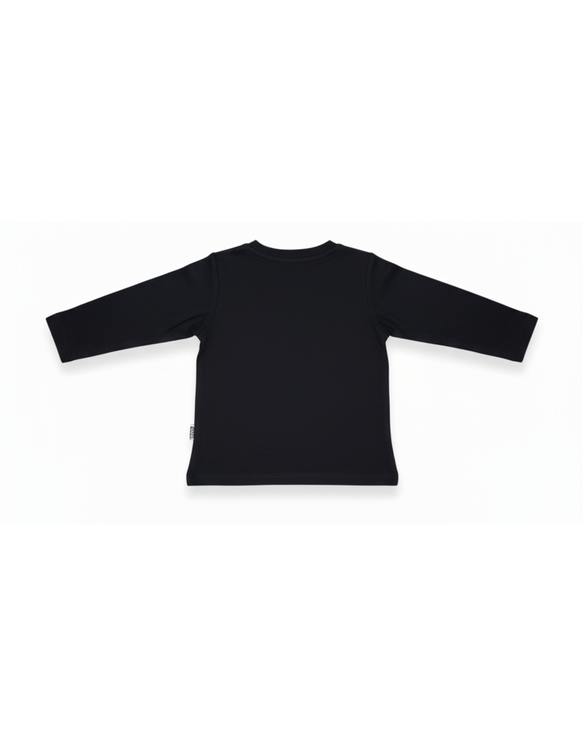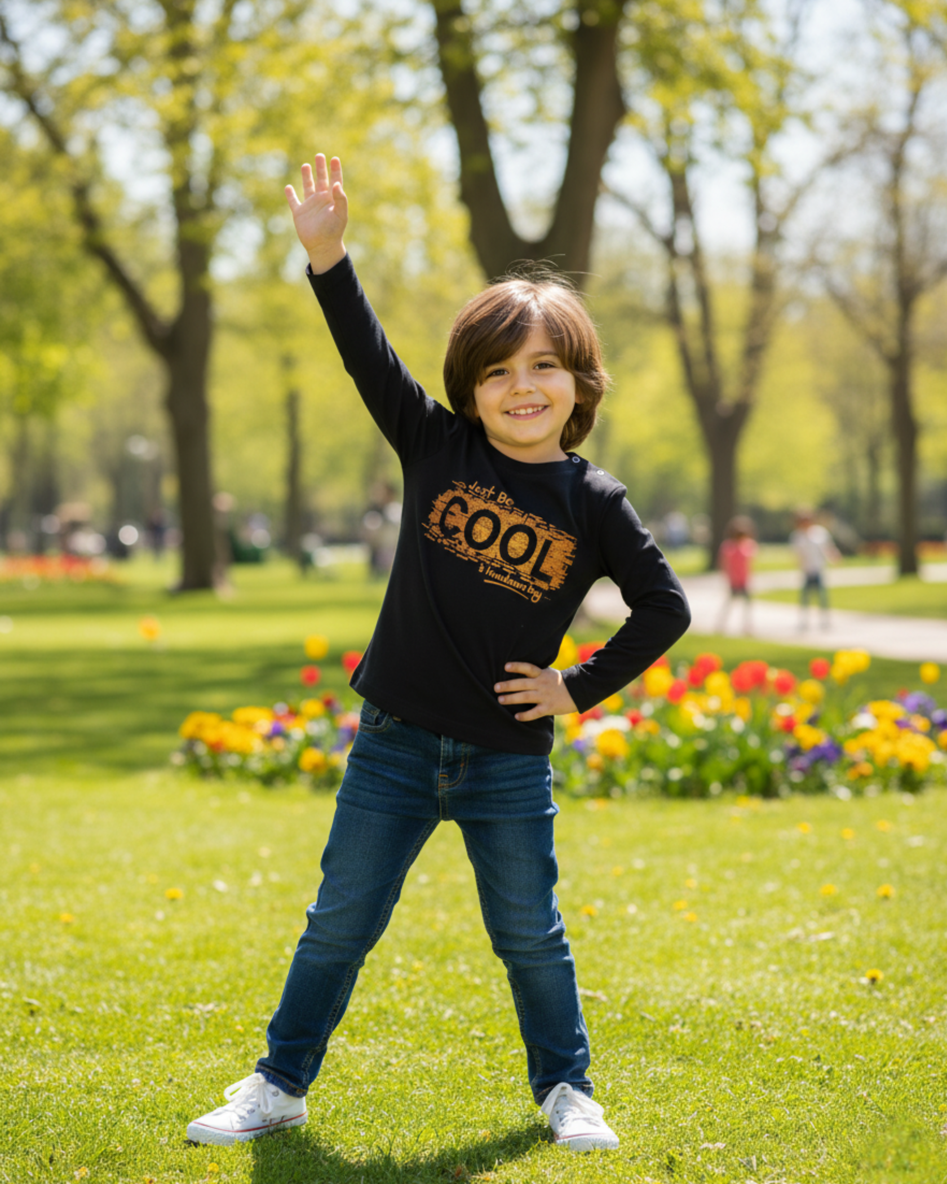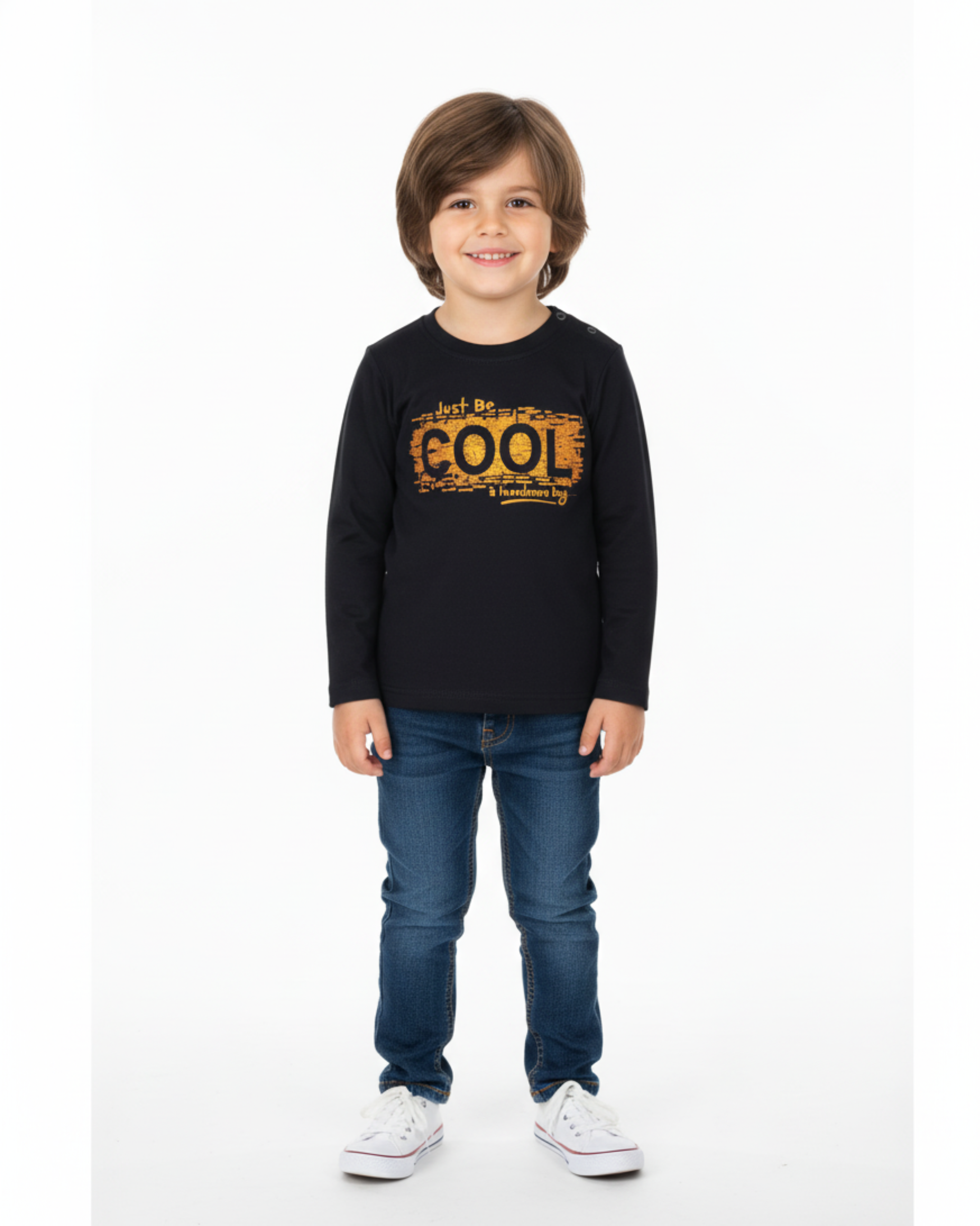 Camiseta de manga larga en color azul marino, con un estampado central tipo grafiti en tonos naranjas y amarillos con el mensaje "Just Be COOL". Incorpora botones de presión en el hombro para facilitar el vestir y desvestir al niño.