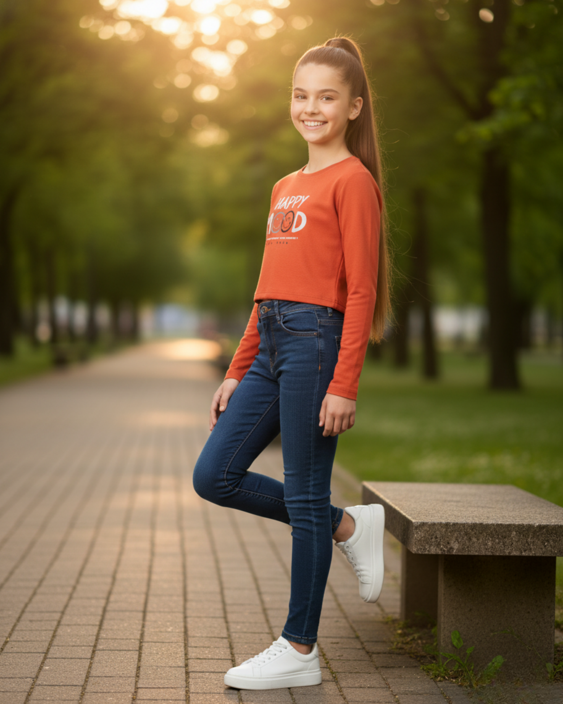 Irradia buen rollo con este top crop de manga larga en un vibrante color naranja. El mensaje "Happy Mood" (Estado de ánimo feliz) y los emojis son el toque de optimismo perfecto. Su corte a la cintura, muy de moda, lo convierte en una pieza juvenil y llena de energía para tus looks diarios. Para un estilo cómodo y a la última moda, úsalo con pantalones deportivos de tiro alto o unos mom jeans.