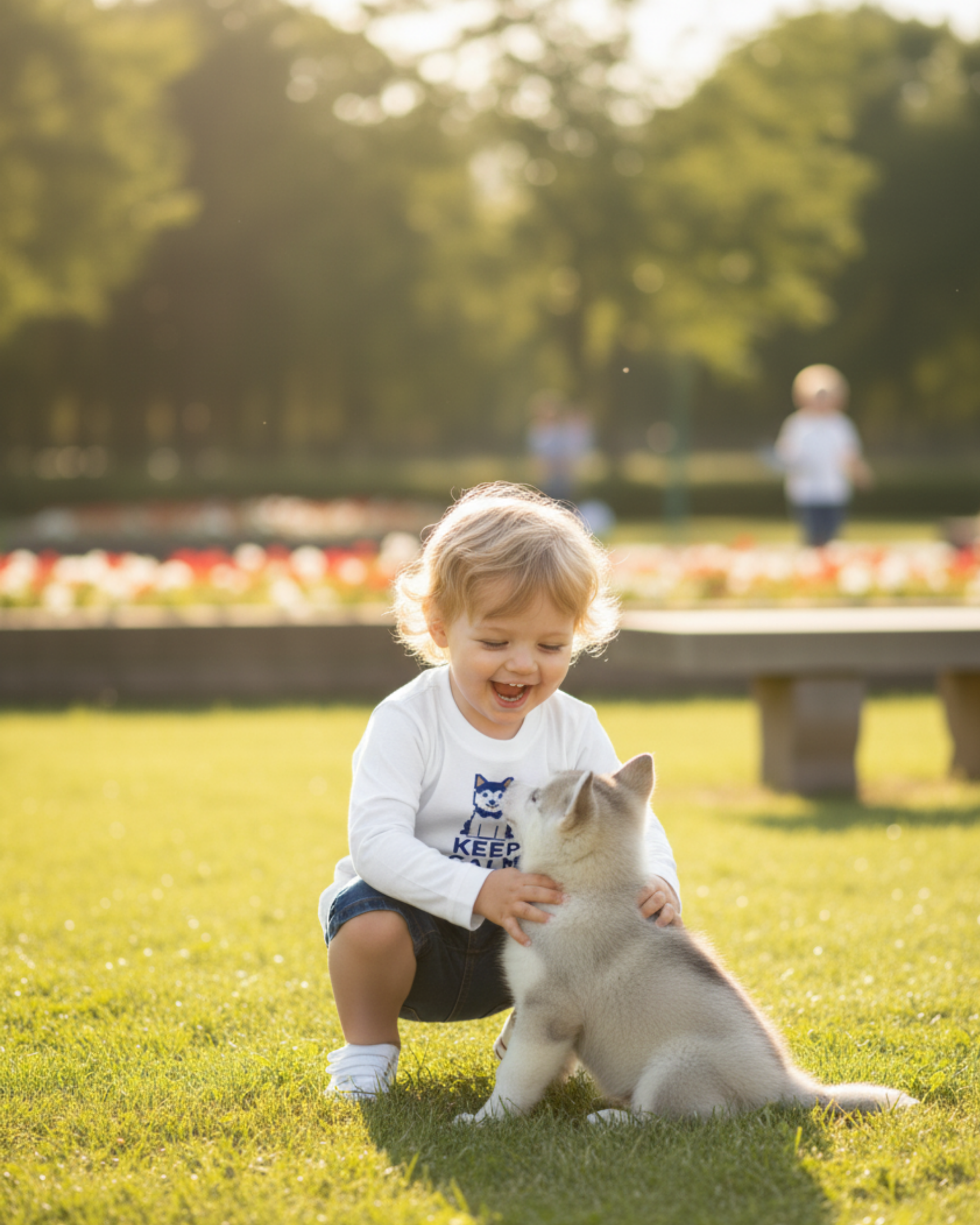 Camiseta de manga larga en color blanco, con un divertido y minimalista estampado en azul marino de un perro husky con el mensaje "KEEP CALM AND HUG A HUSKY" (Mantén la calma y abraza a un husky). Ideal para un look casual y amante de los perros.