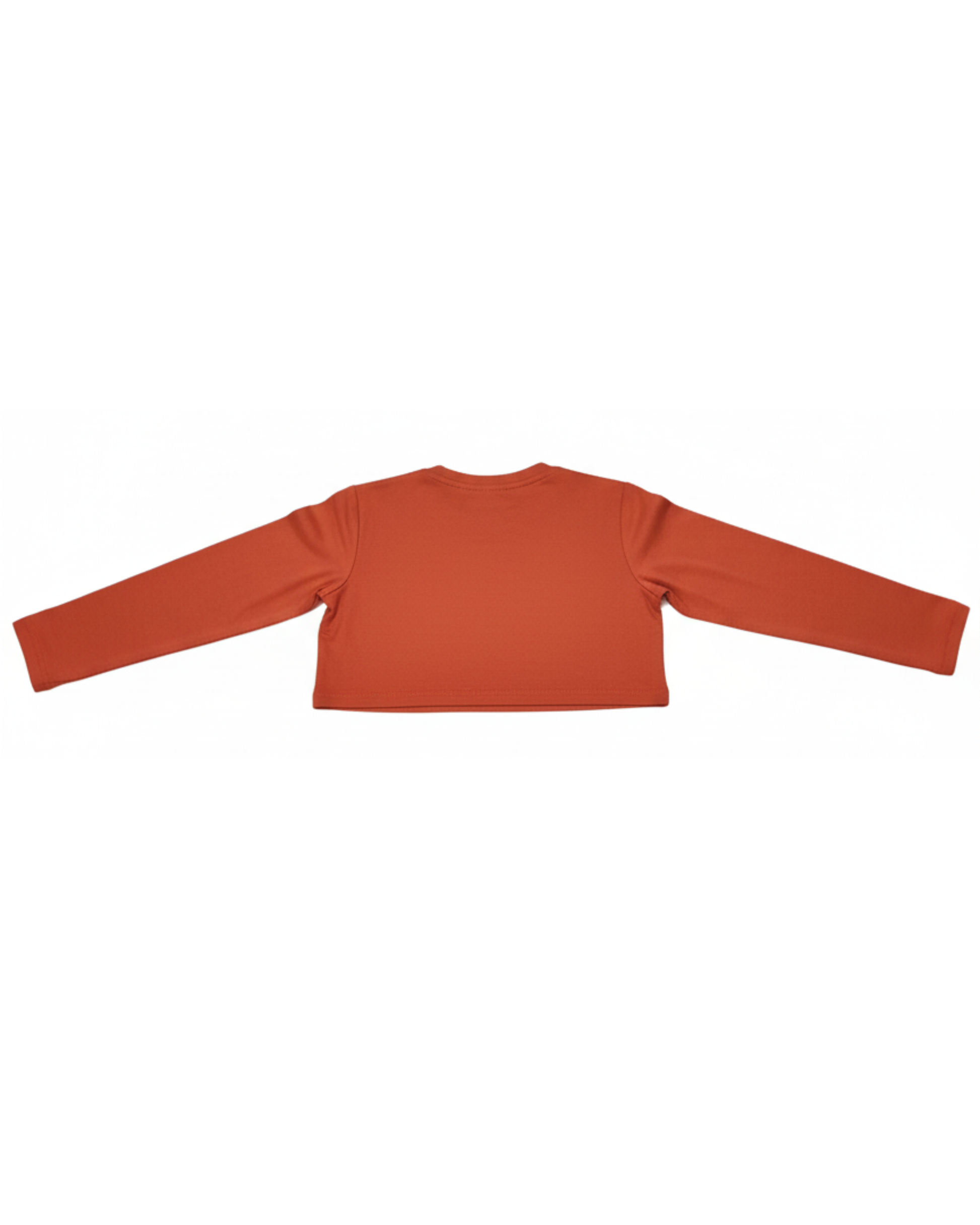 Camiseta de manga larga en un vibrante color naranja rojizo con un estampado frontal de inspiración deportiva. El diseño incluye el número "90" y el mensaje "JUST PLAY & HAVE FUN" (Solo juega y diviértete). Ideal para un look enérgico y casual.