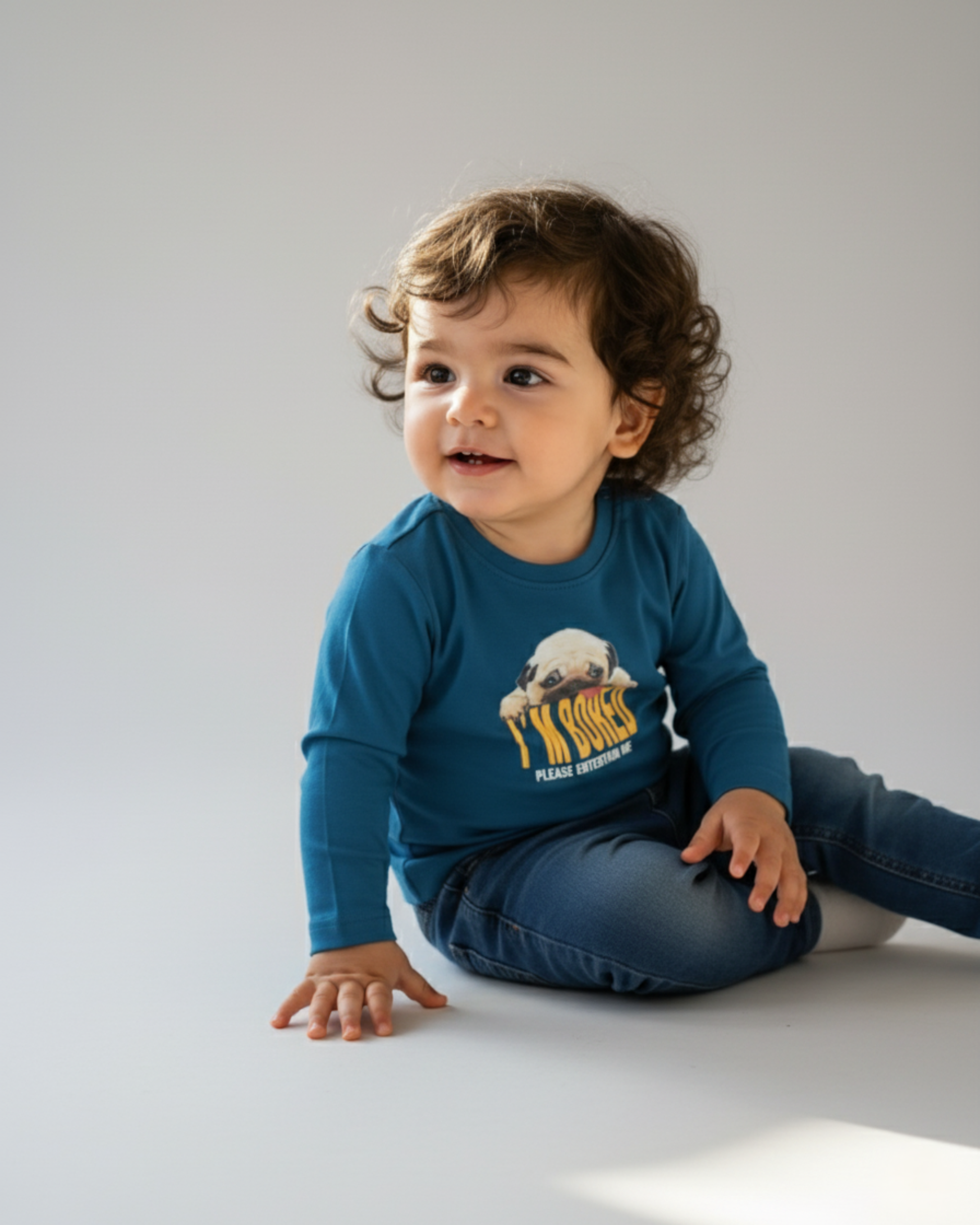 Camiseta de manga larga en color azul para bebé, con un divertido estampado de un perrito y el mensaje "I'M BORED. PLEASE ENTERTAIN ME" (Estoy aburrido. Por favor, entretenme). Confeccionada en tejido suave y equipada con botones de presión en el hombro para facilitar el cambio.