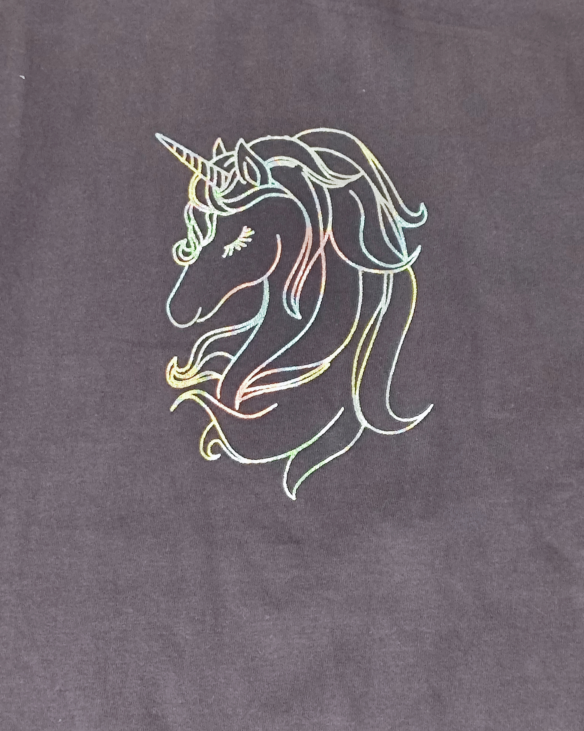 Camiseta de manga larga en color azul marino, con un llamativo estampado de un unicornio en colores iridiscentes/arcoíris. De corte liso, es ideal para un look casual con un toque mágico y moderno.