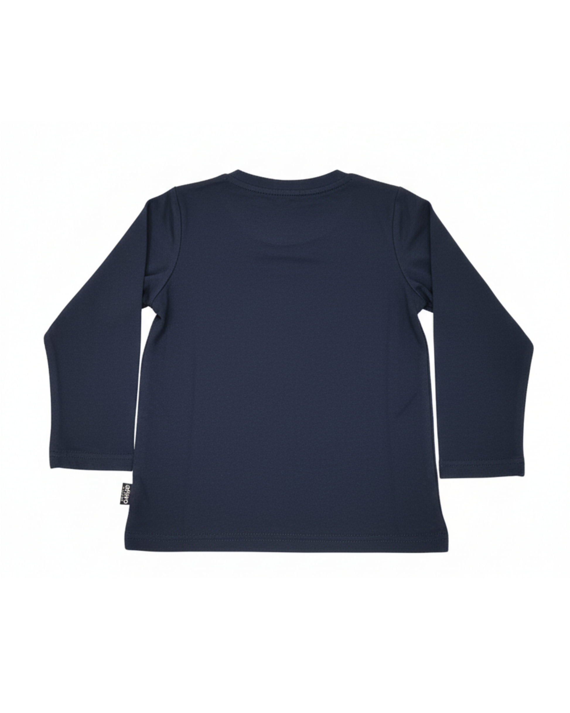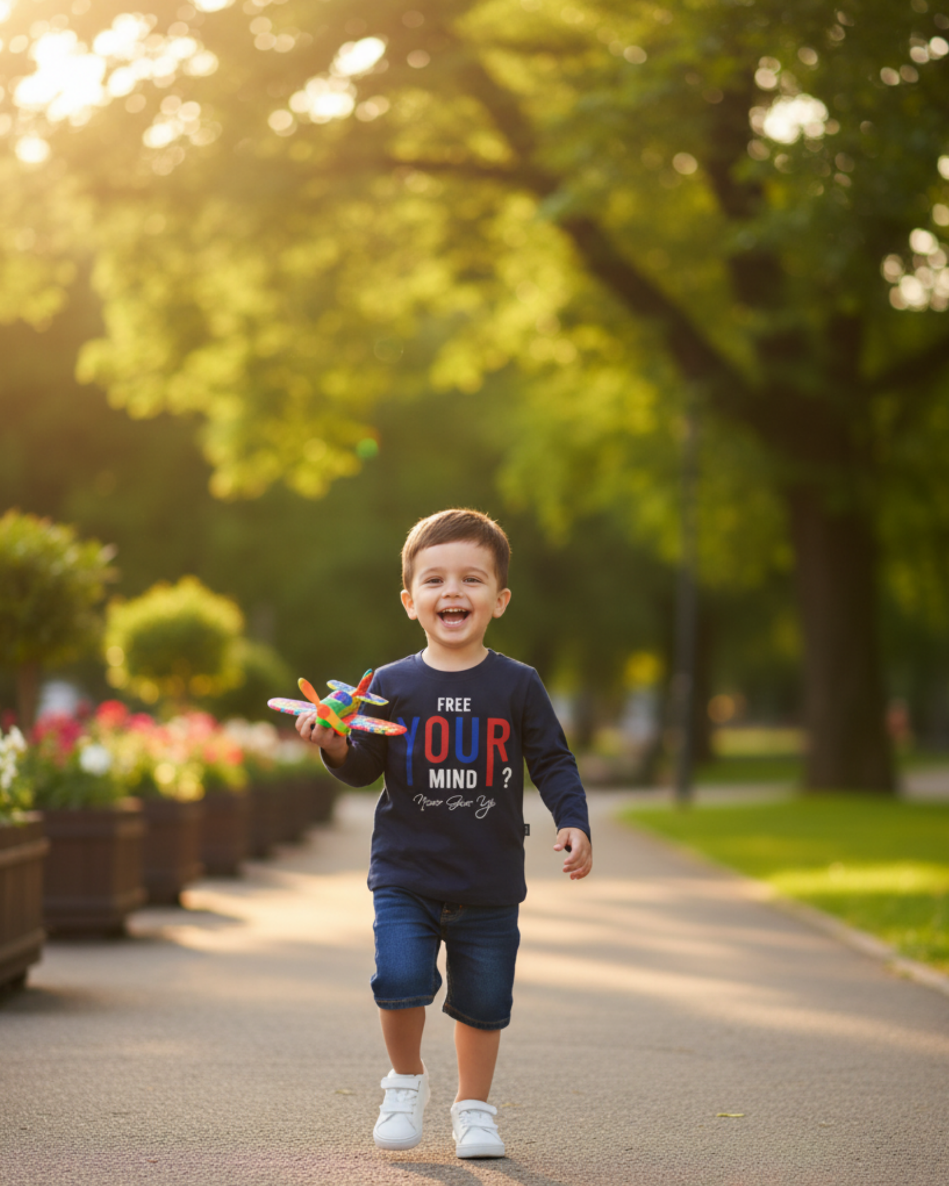 Camiseta de manga larga en color azul marino, con un diseño motivacional en el pecho con las palabras "FREE YOUR MIND" (Libera tu mente) en color blanco, azul y rojo, y el mensaje "Never Give Up" (Nunca te rindas). Ideal para un estilo enérgico y casual.