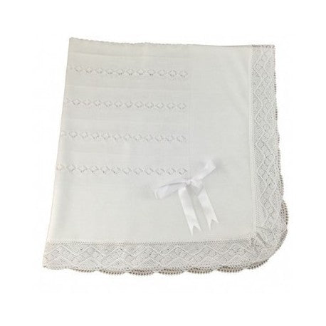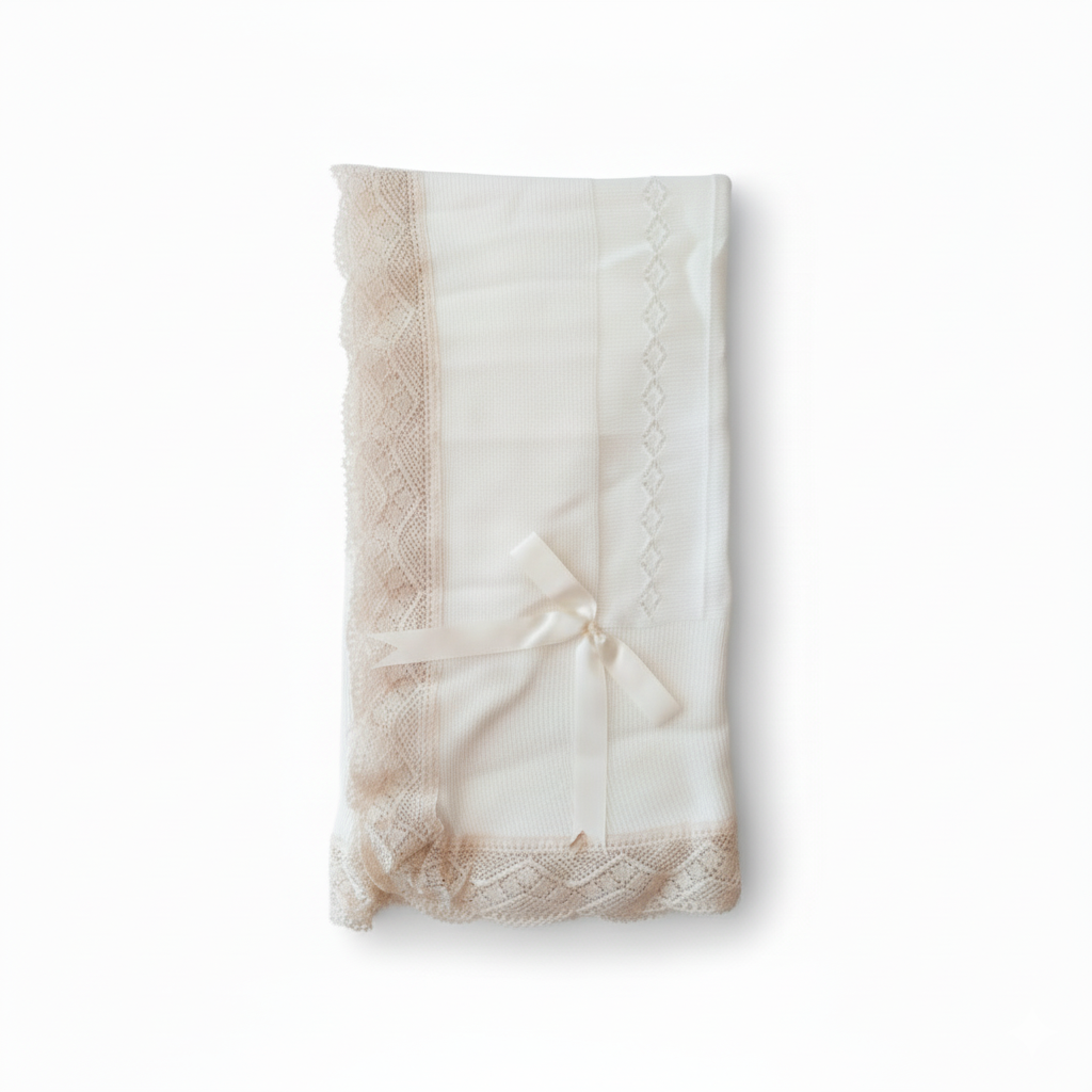 Este chal o manta de bebé es una prenda clásica y delicada, ideal para el cochecito, la cuna o para envolver al recién nacido en días de bautizo o ceremonias. Confeccionada en un tejido de punto crudo con patrones de punto calado (o ajour) en franjas horizontales. Destaca por un elegante borde de encaje ancho y festoneado, y un lazo de raso blanco para un toque final.