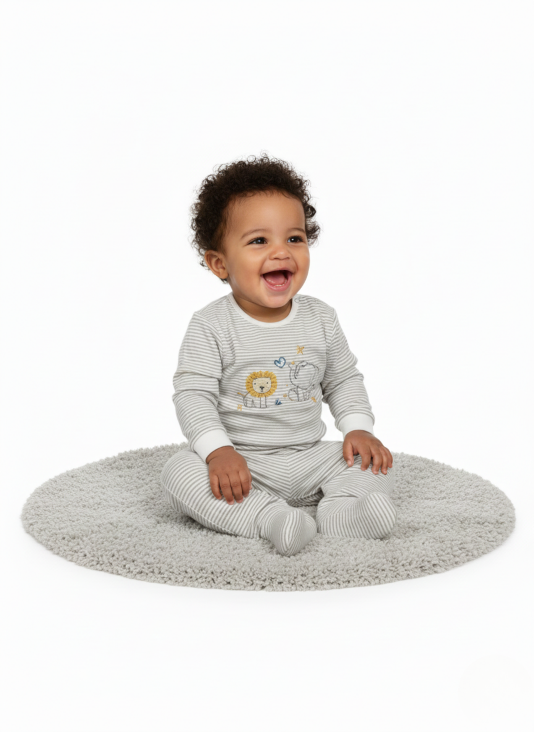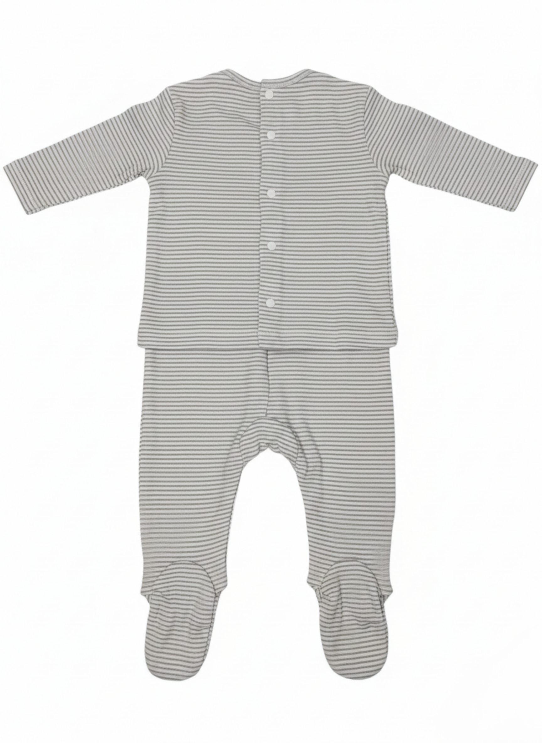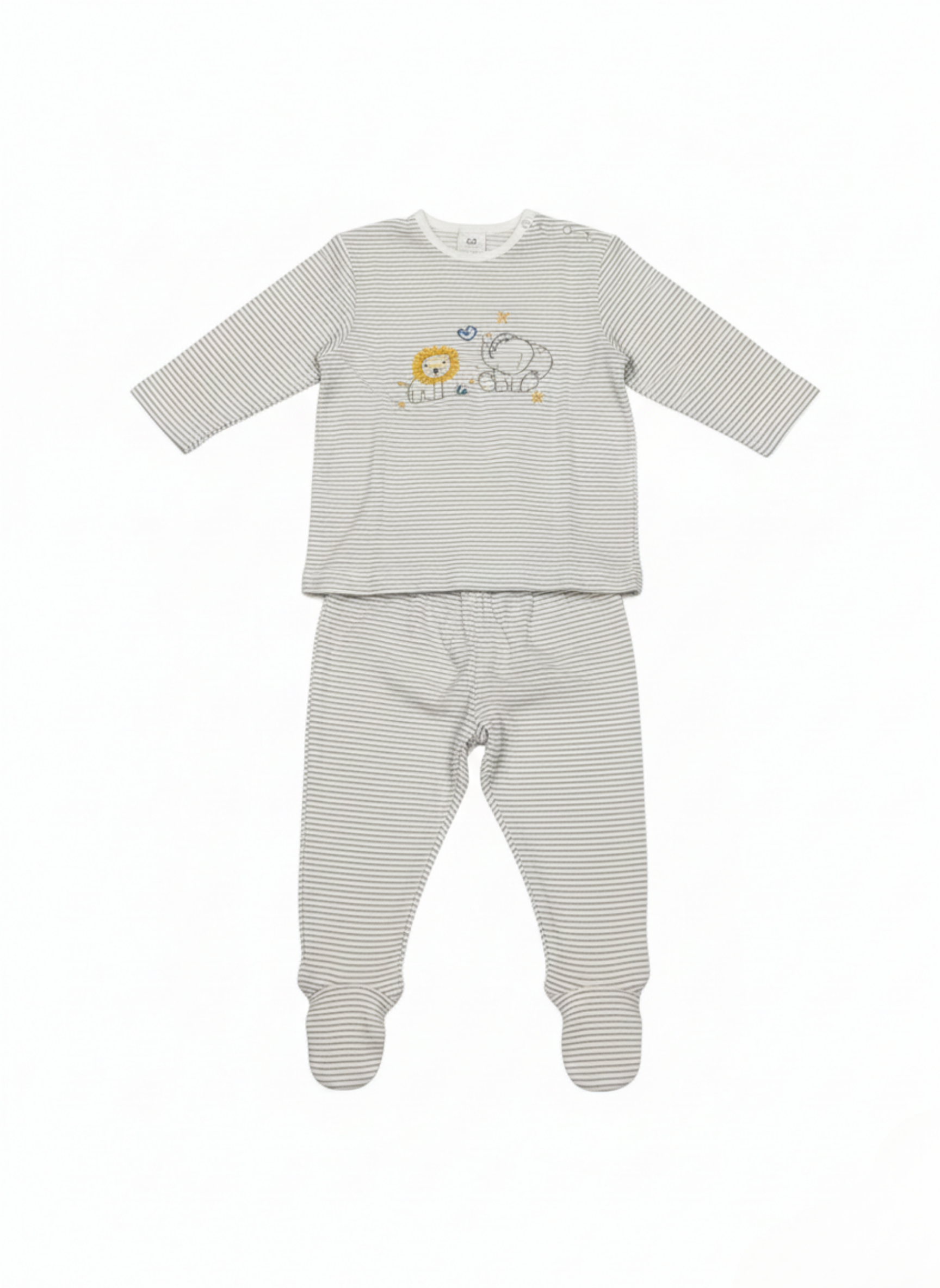 Este es un conjunto de dos piezas para bebé, compuesto por una camiseta de manga larga y un pantalón con pie cubierto (polaina). Presenta un diseño clásico de rayas horizontales finas en color gris y blanco en ambas piezas. La camiseta destaca por un bordado central de un león y un elefante acompañados de pequeñas estrellas y un corazón. Incluye una apertura lateral en el cuello con botones de presión para facilitar el vestir.