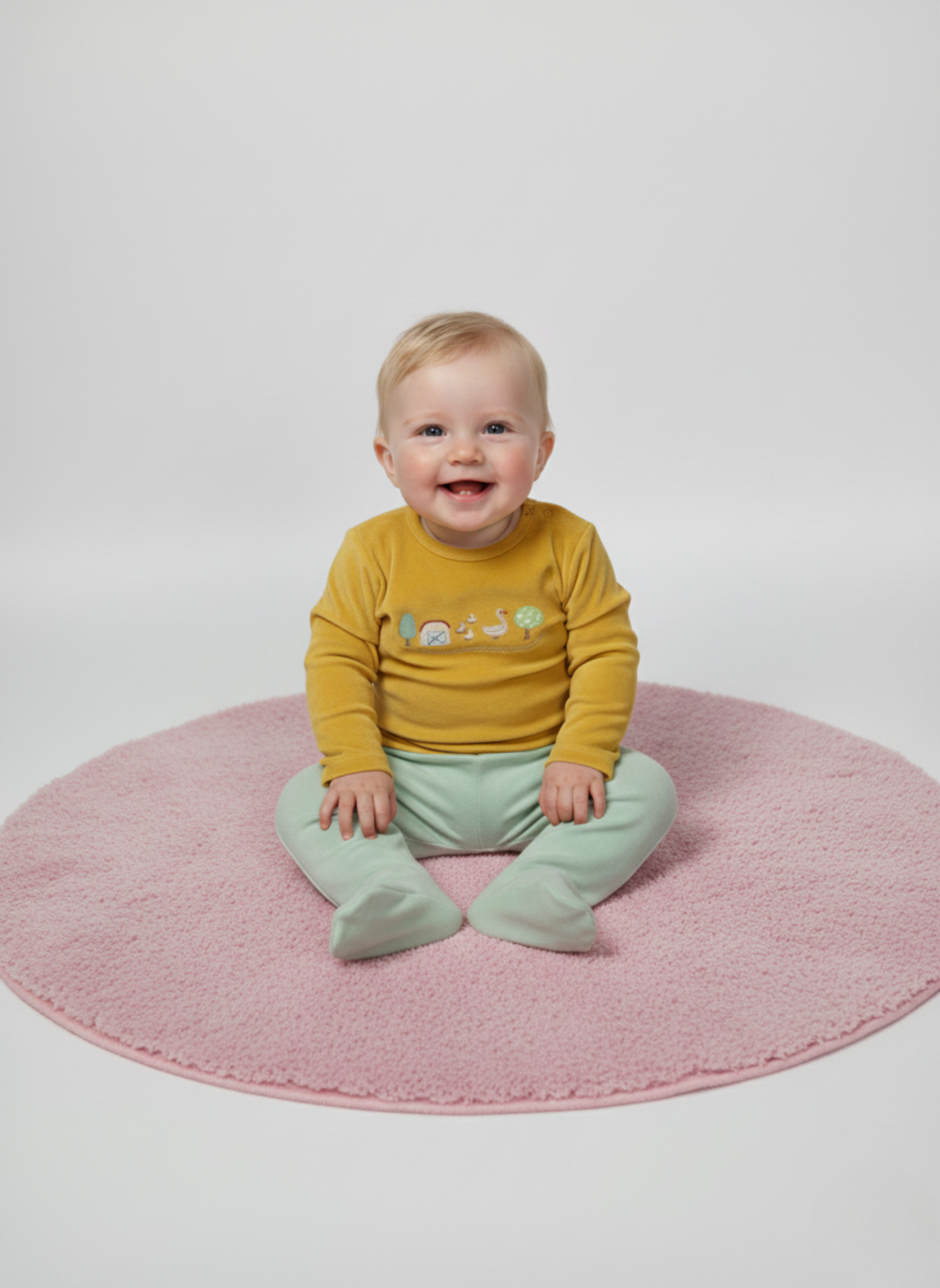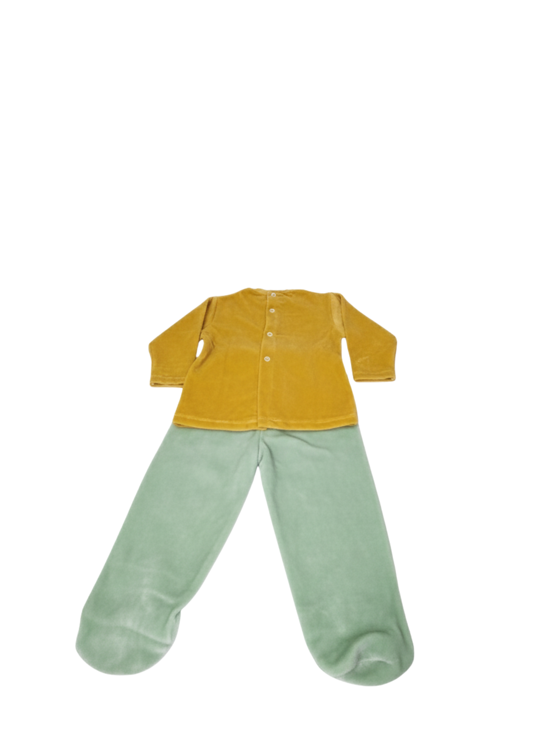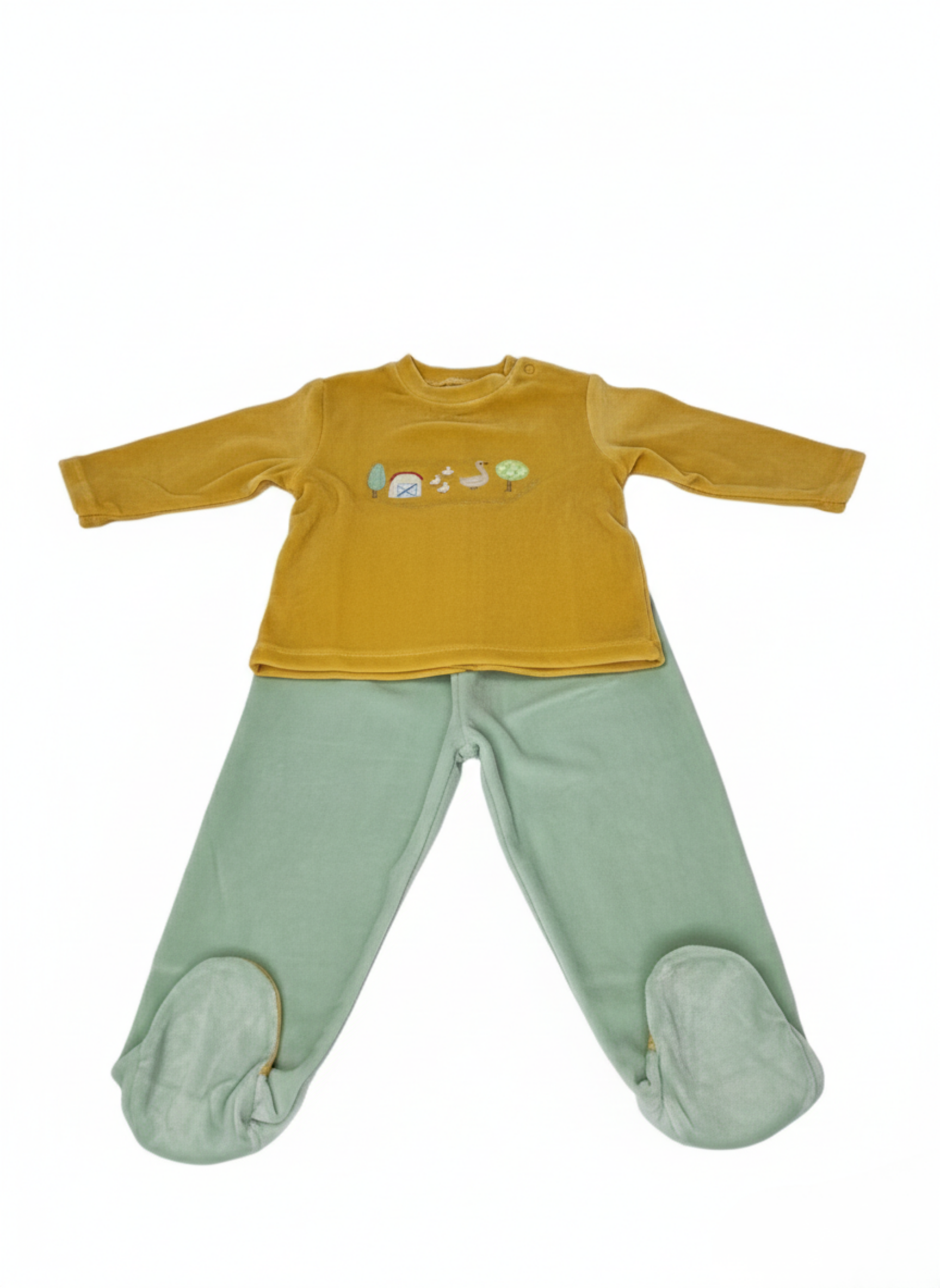 Este es un conjunto de dos piezas para bebé, compuesto por una camiseta de manga larga y un pantalón con pie cubierto (polaina). Está confeccionado en un cálido tejido de terciopelo con una combinación de colores otoñales: la parte superior en amarillo mostaza y la inferior en verde menta. La camiseta destaca por un bordado central con motivos de granja, que incluye un granero, patitos y árboles. Cuenta con botones de presión en el hombro para facilitar el paso de la cabeza.