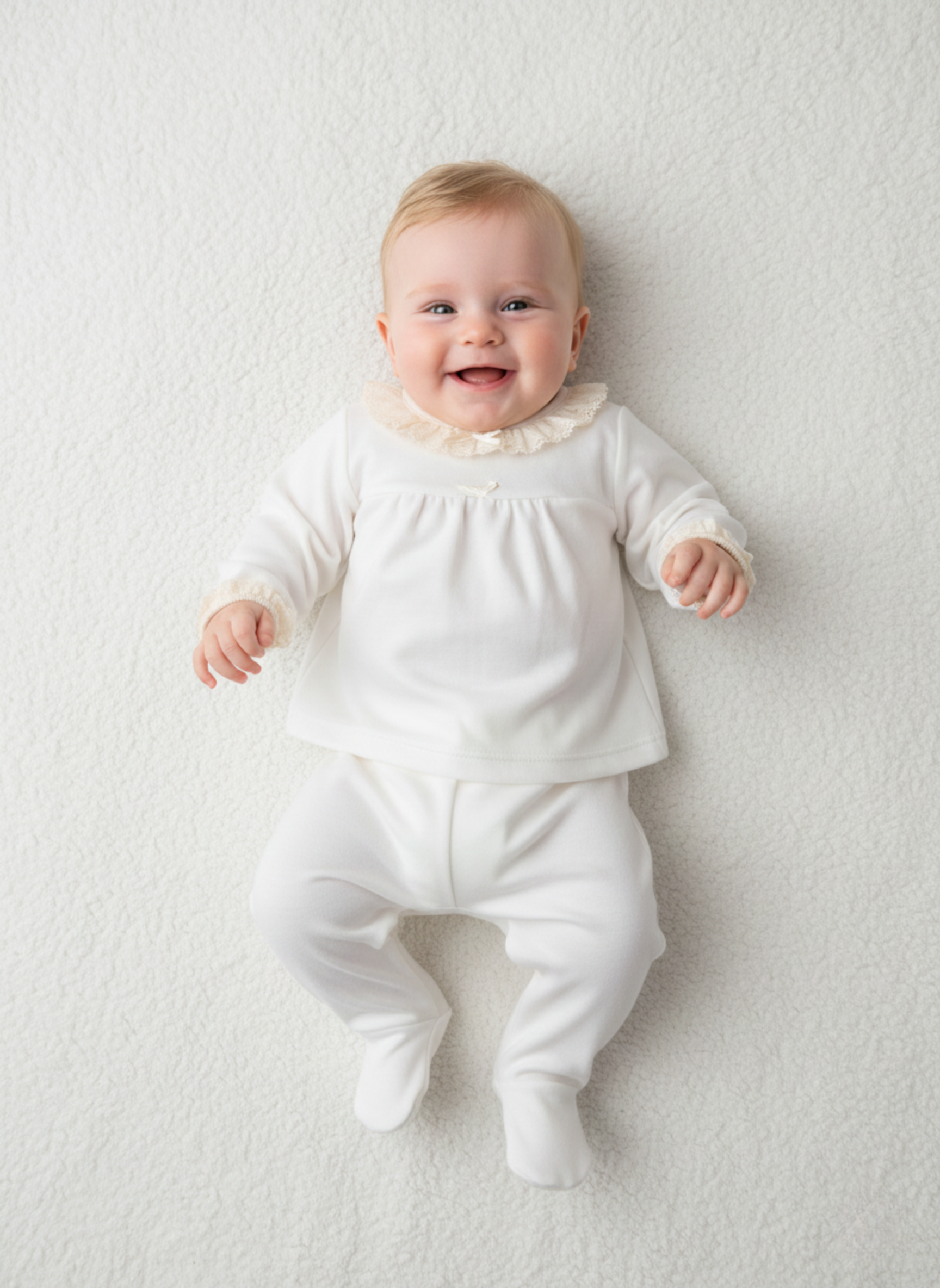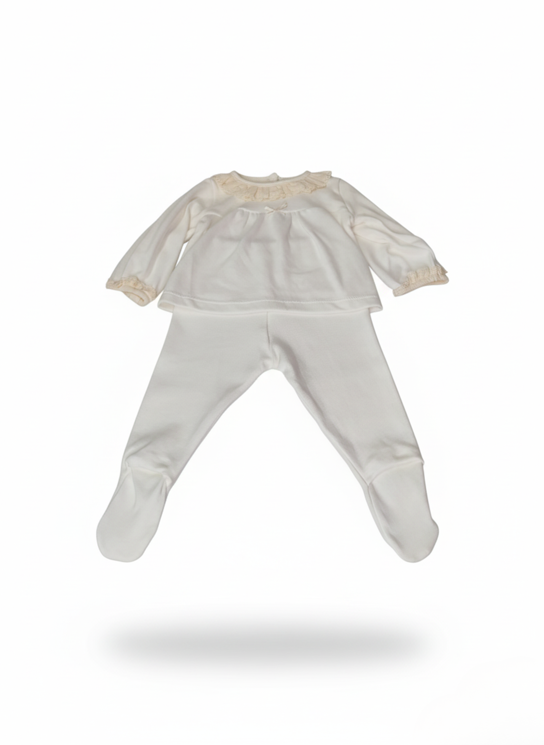Este es un conjunto de dos piezas para bebé. La parte superior es un top/camiseta de manga larga de color blanco crudo. El diseño presenta un volante fruncido de encaje alrededor del cuello y pequeños detalles de encaje en los puños. La parte inferior es un pantalón liso que incluye pie cubierto (tipo polaina/calcetín), confeccionado en el mismo tejido de punto suave.