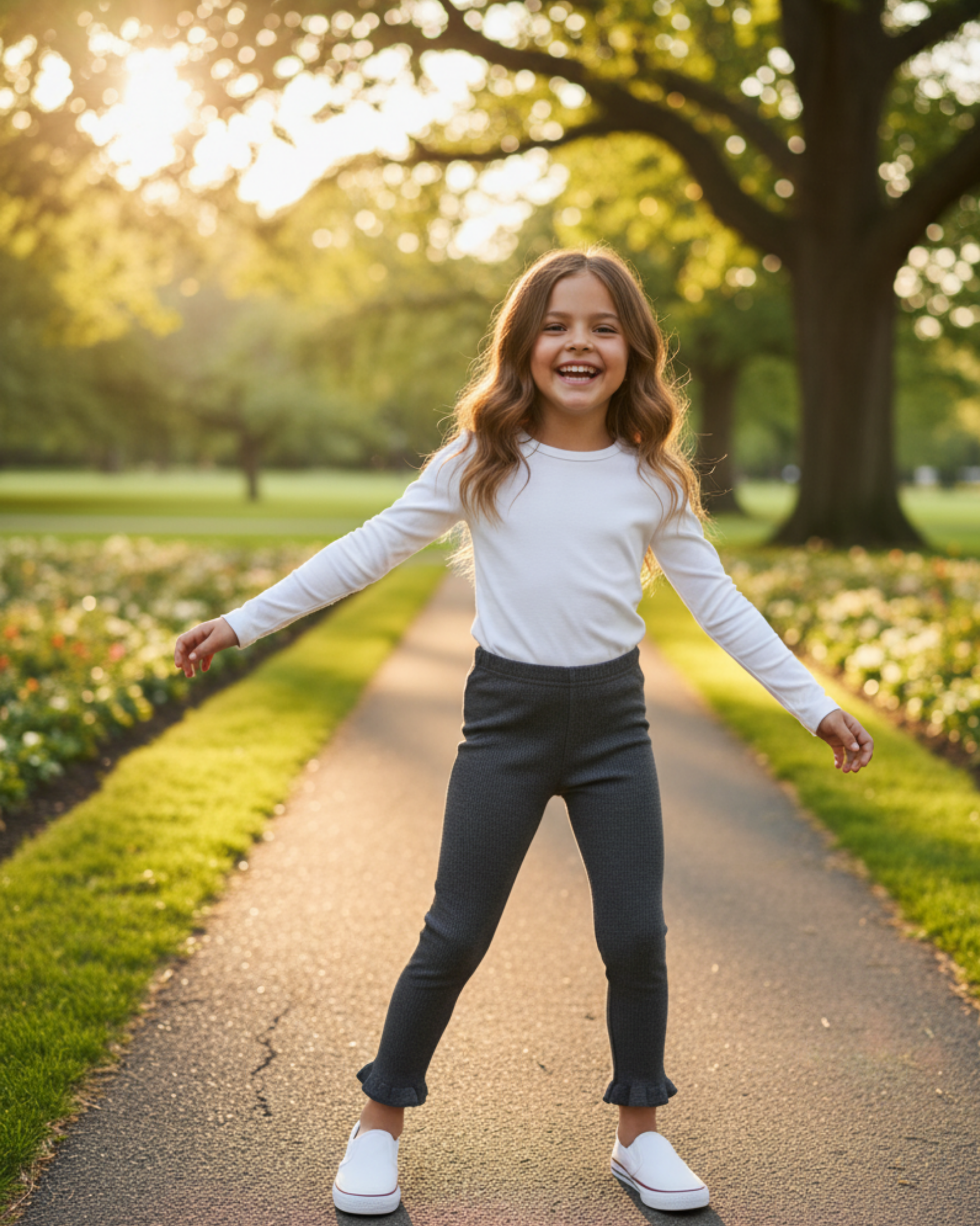 Leggings de niña en color gris oscuro con un patrón microtexturizado, cintura elástica y un detalle coqueto de volante en el bajo de los tobillos. Son cómodos y versátiles para el día a día.