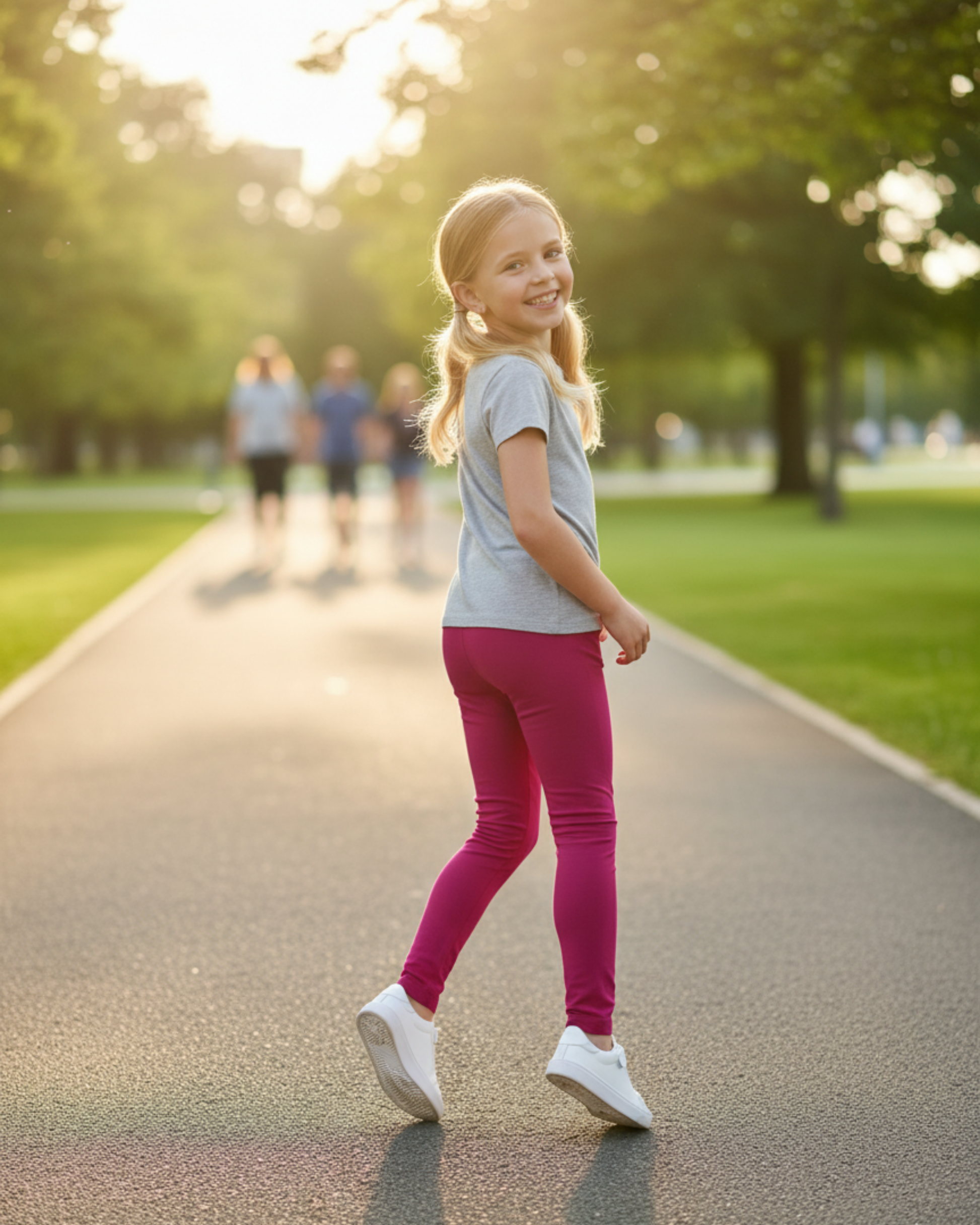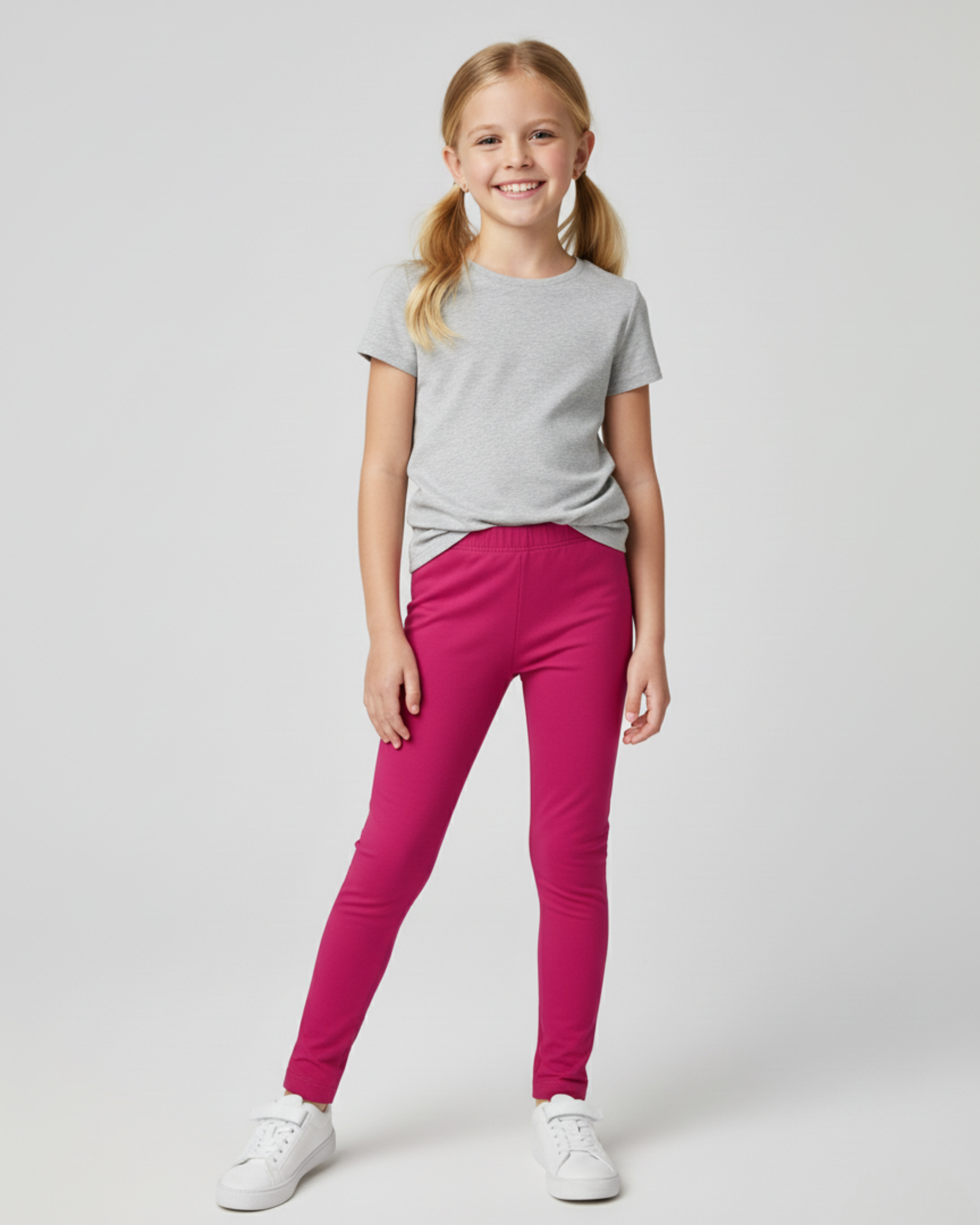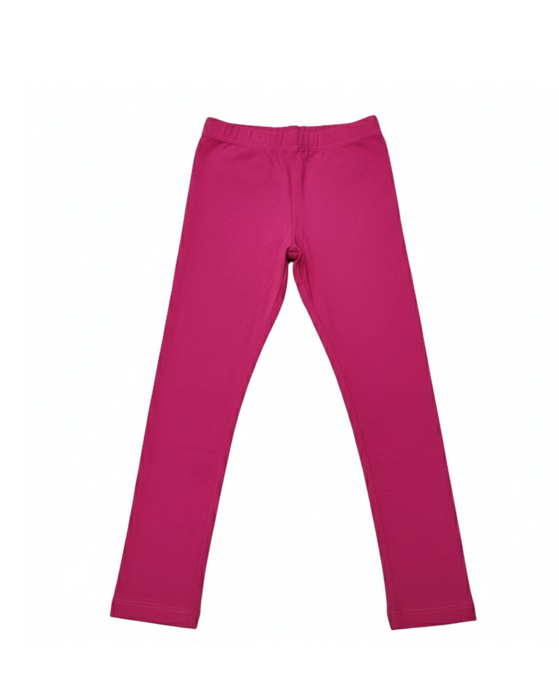 Leggings de niña en color fucsia brillante (rosa fuerte), con cintura elástica para un ajuste cómodo. Es una prenda básica en un color vibrante, ideal para añadir un toque de alegría a cualquier conjunto.