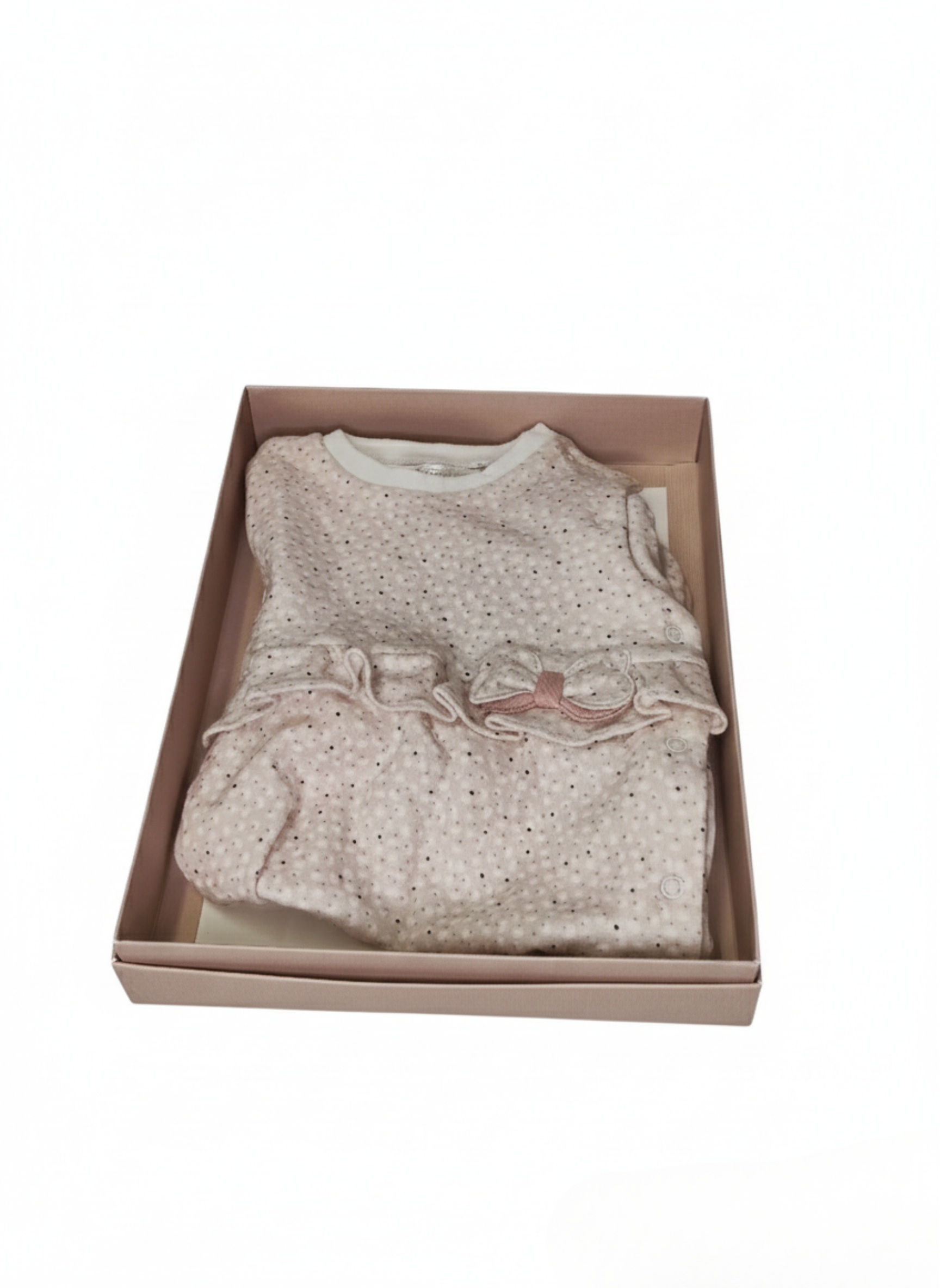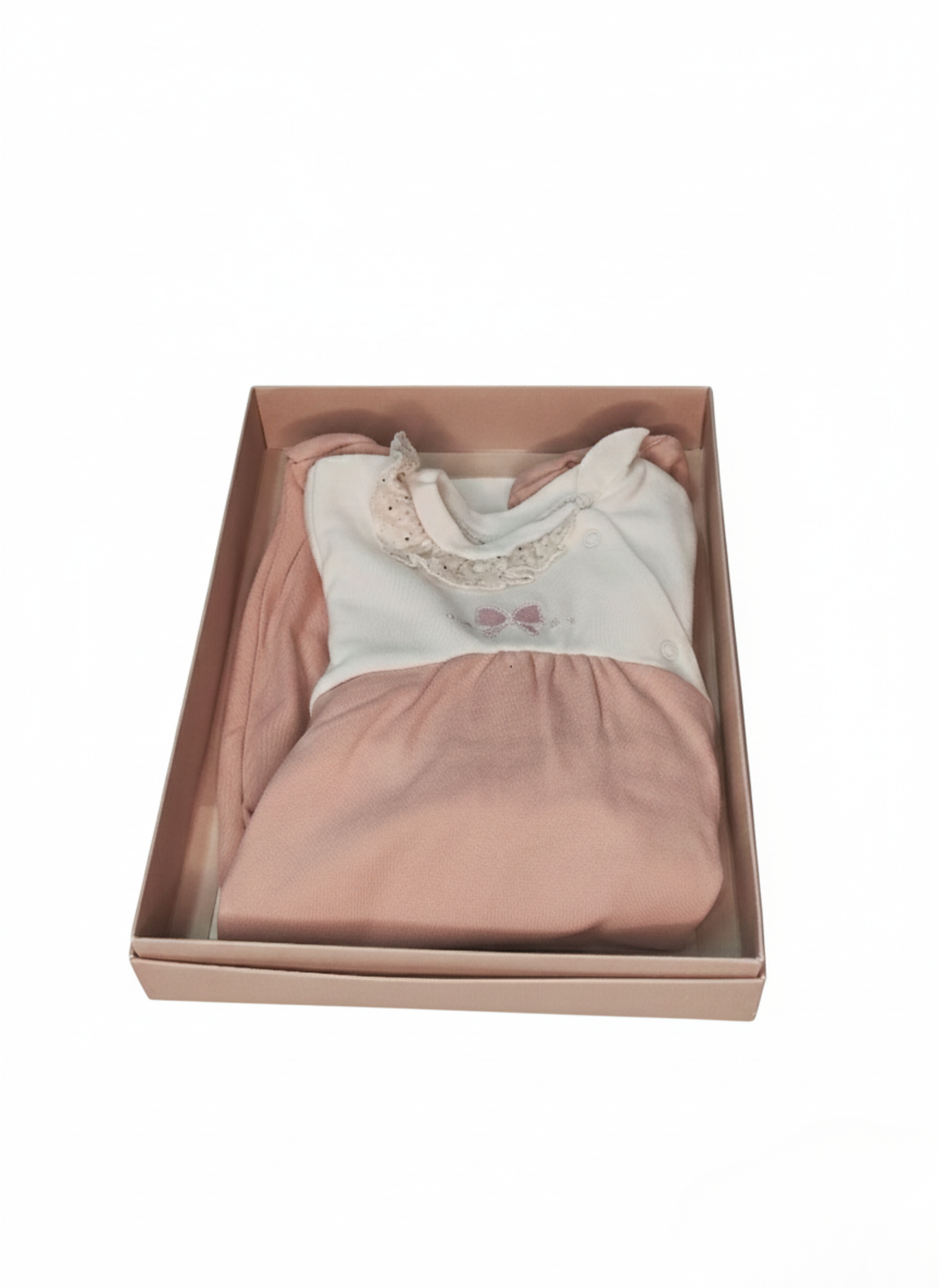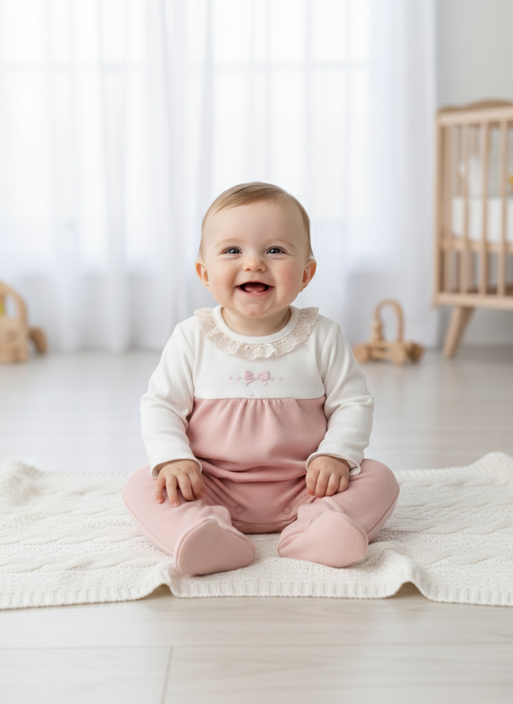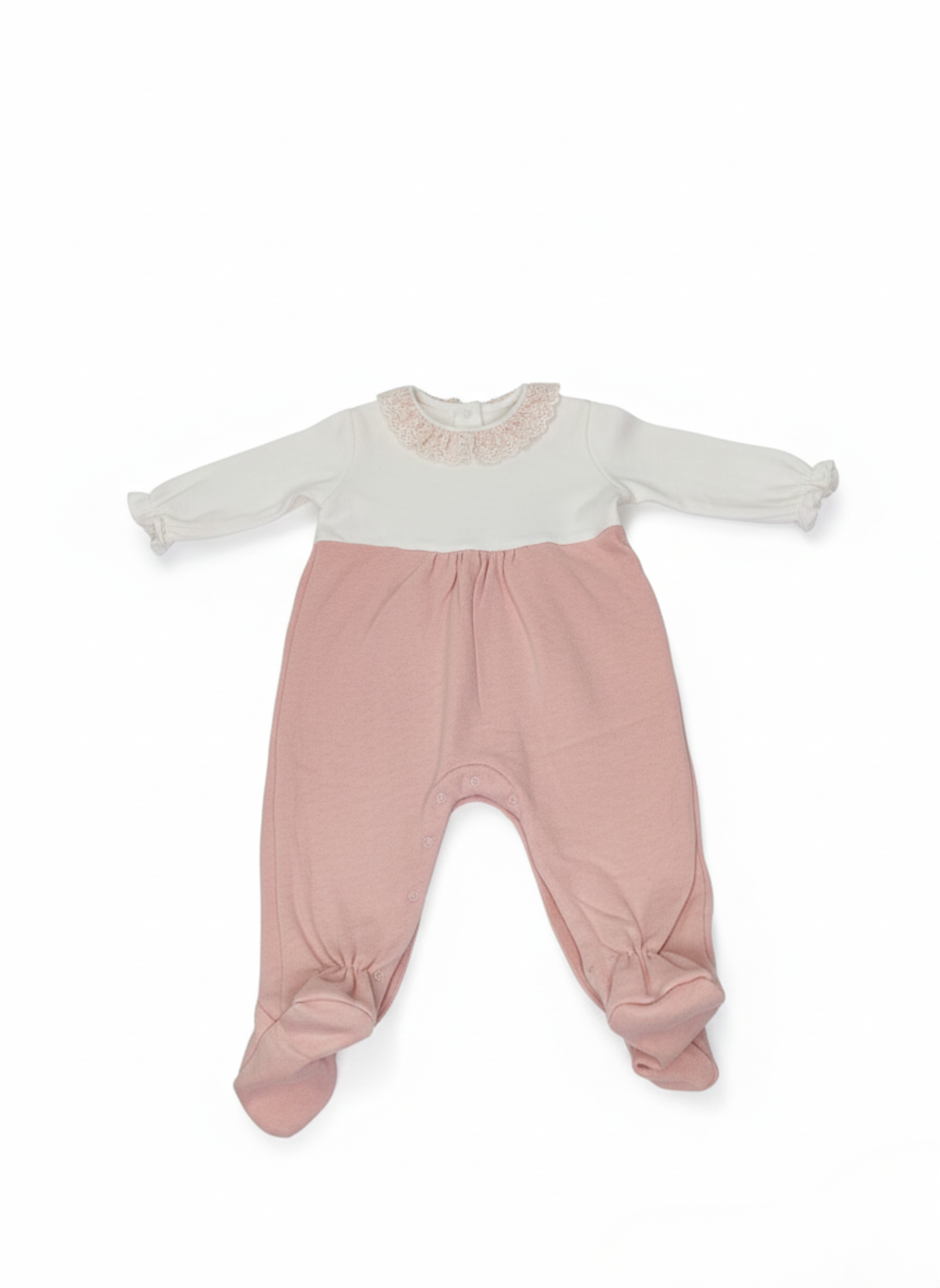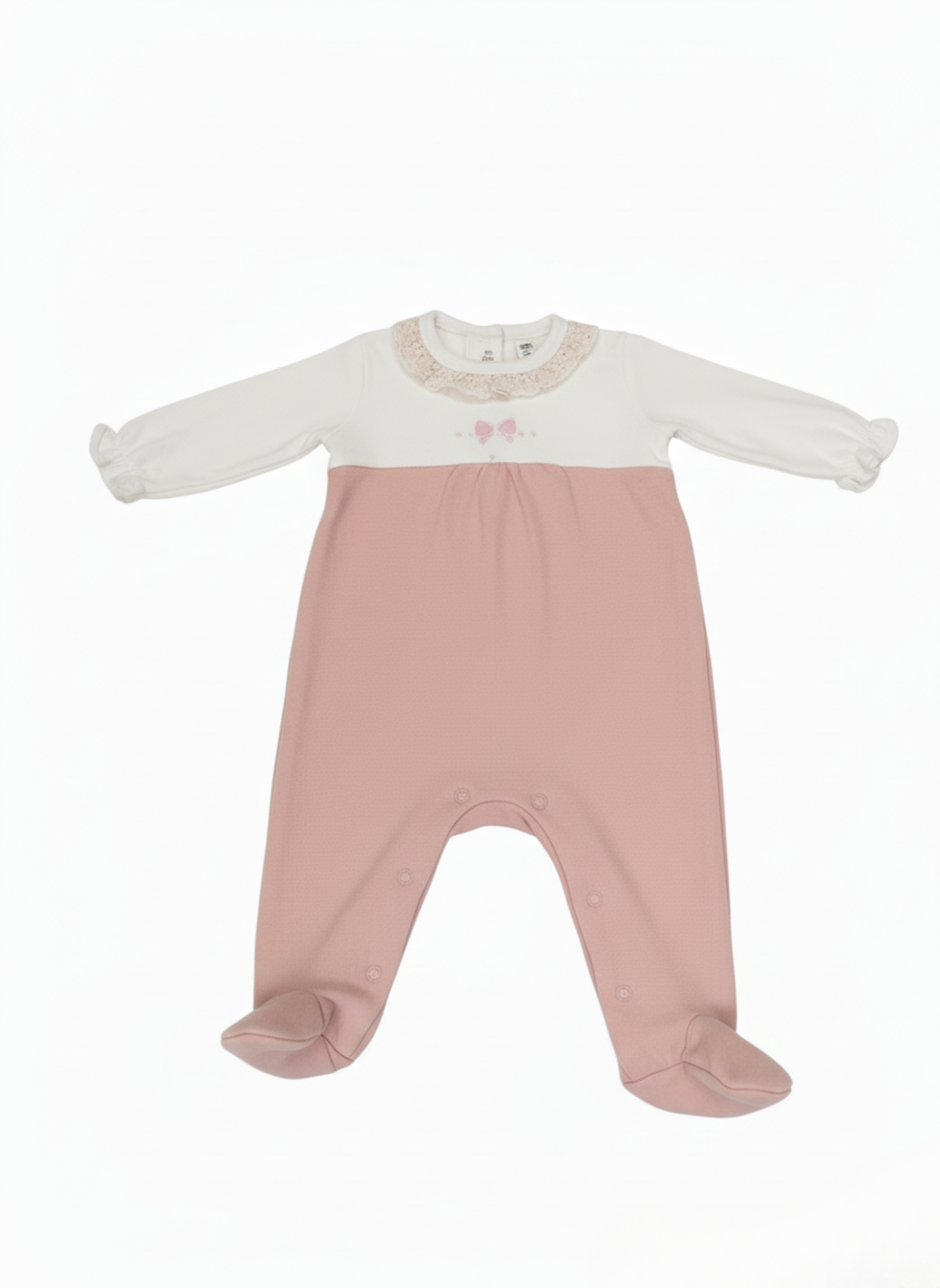 Este es un pelele de una sola pieza, de manga larga y con pie cubierto (polaina/calcetín) para bebé. El diseño es bicolor: la parte superior es de punto liso blanco y la parte inferior es de rosa pálido. La parte superior tiene un volante de encaje calado en el cuello y un lazo rosa bordado en la pechera, con frunces bajo el pecho. Ideal para mantener al bebé abrigado en invierno. Combínalo con una manta suave de muselina en color blanco o gris, y un gorrito de punto fino a juego.