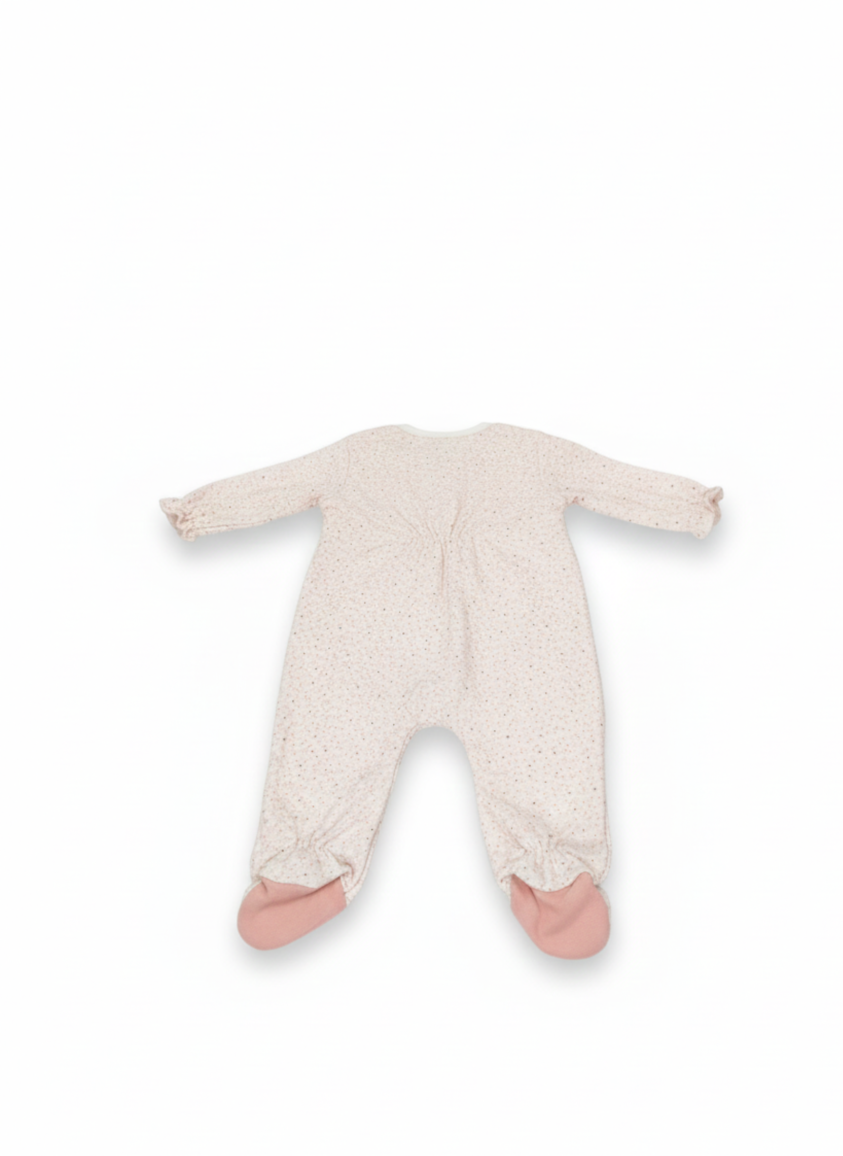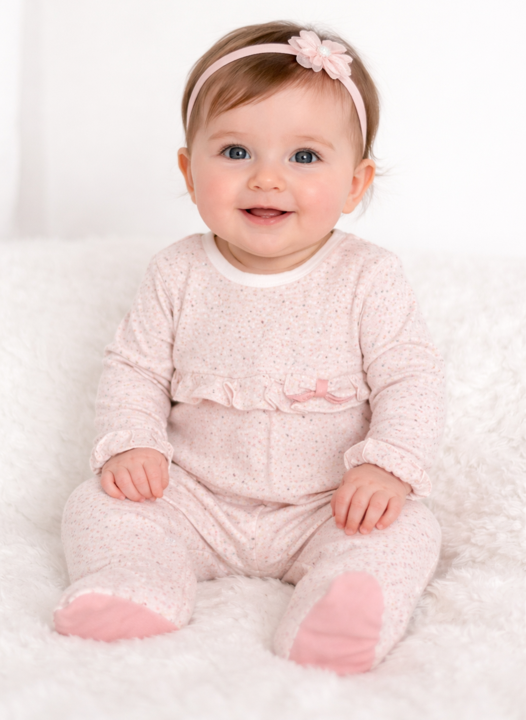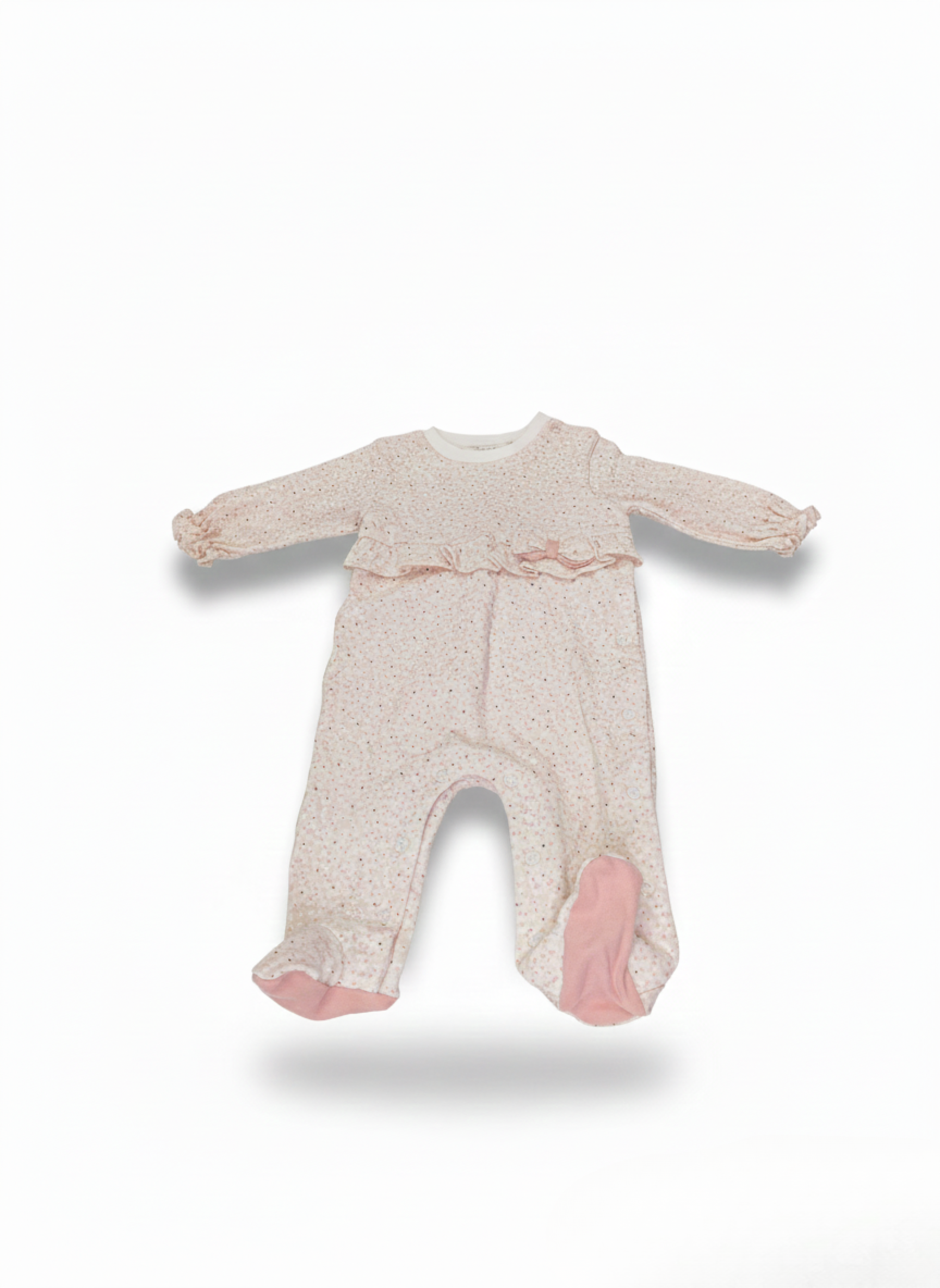 Este es un pelele de una sola pieza, de manga larga y con pie cubierto (polaina/calcetín) para bebé. La parte inferior y el cuerpo son de color rosa pálido con un estampado sutil de lunares/flores pequeñas. La parte superior tiene un volante fruncido que va de hombro a hombro. El diseño tiene frunces en los puños y el pie cubierto es de color rosa sólido. Ideal para mantener al bebé abrigado en invierno. Combínalo con una chaqueta de punto fino en color blanco crudo o gris y un gorrito de lana a juego.