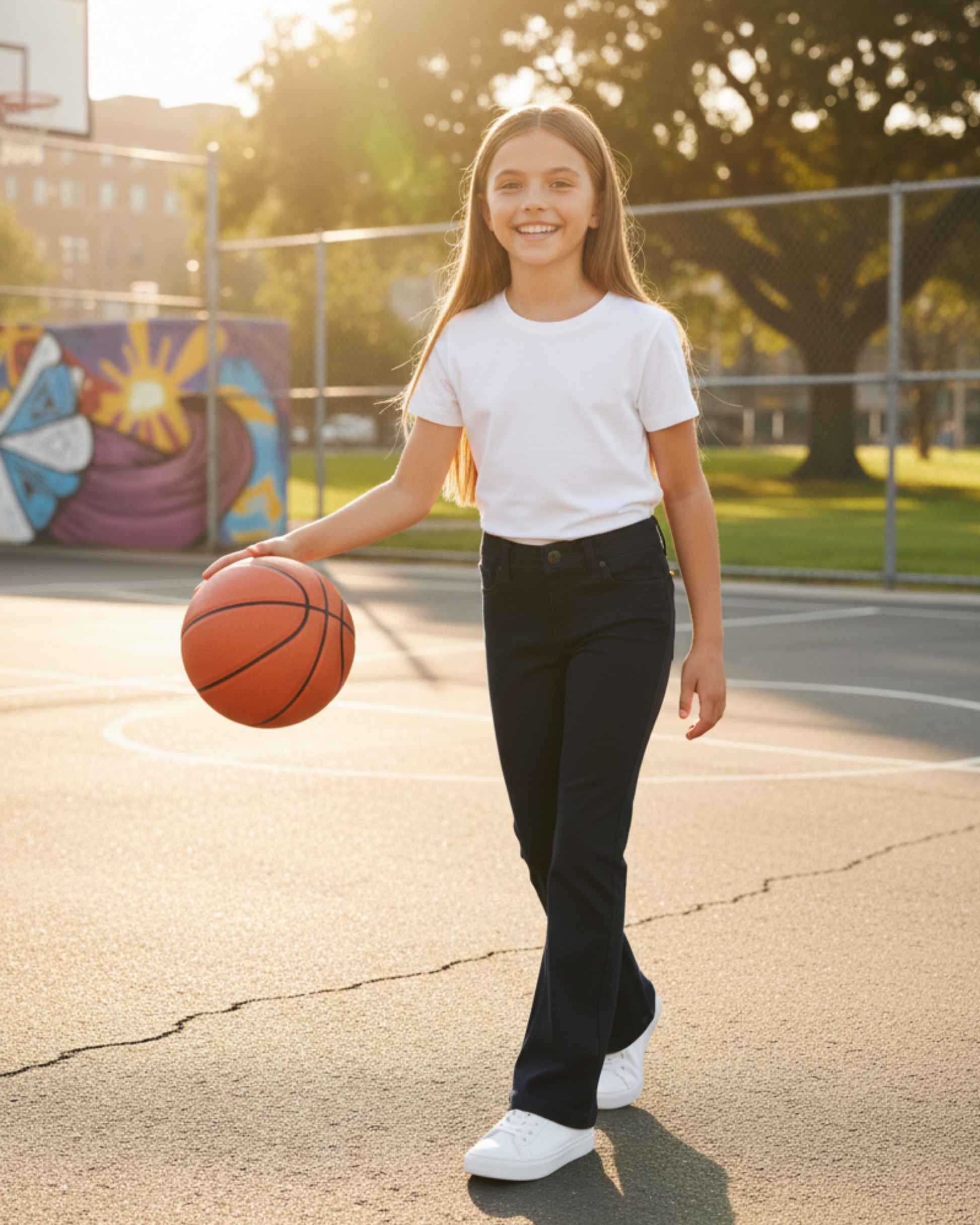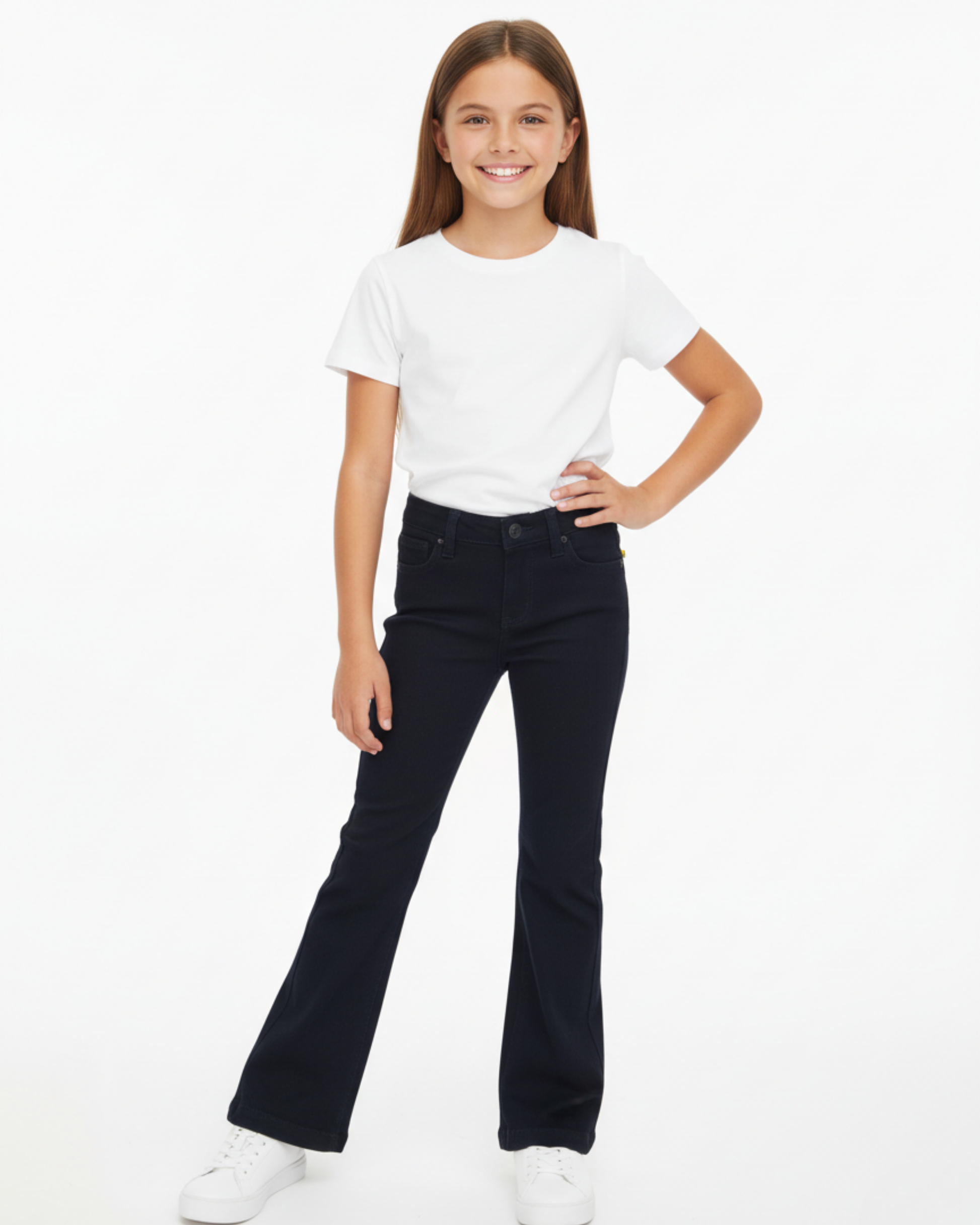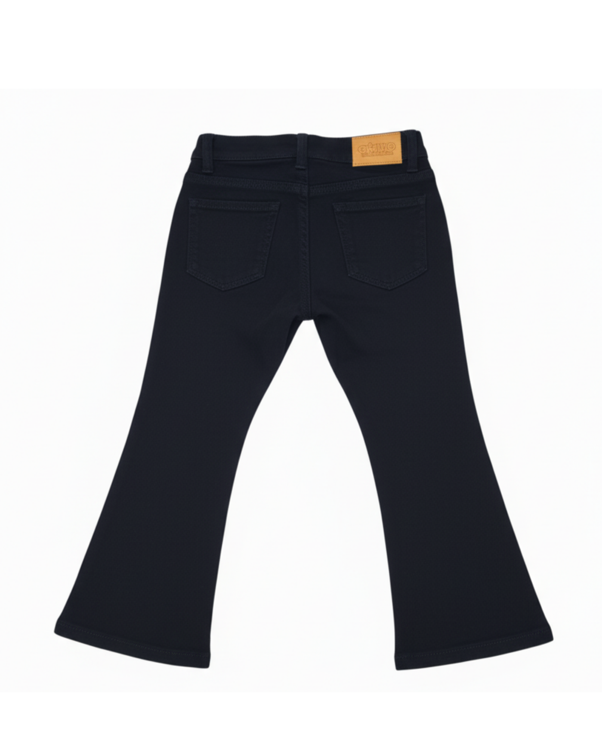 Pantalón de niña tipo vaquero en color azul marino oscuro, con un diseño de tiro medio y corte acampanado (flare). Presenta un estilo clásico con bolsillos delanteros y traseros, y cierre de botón y cremallera, ideal para un look retro y a la moda.