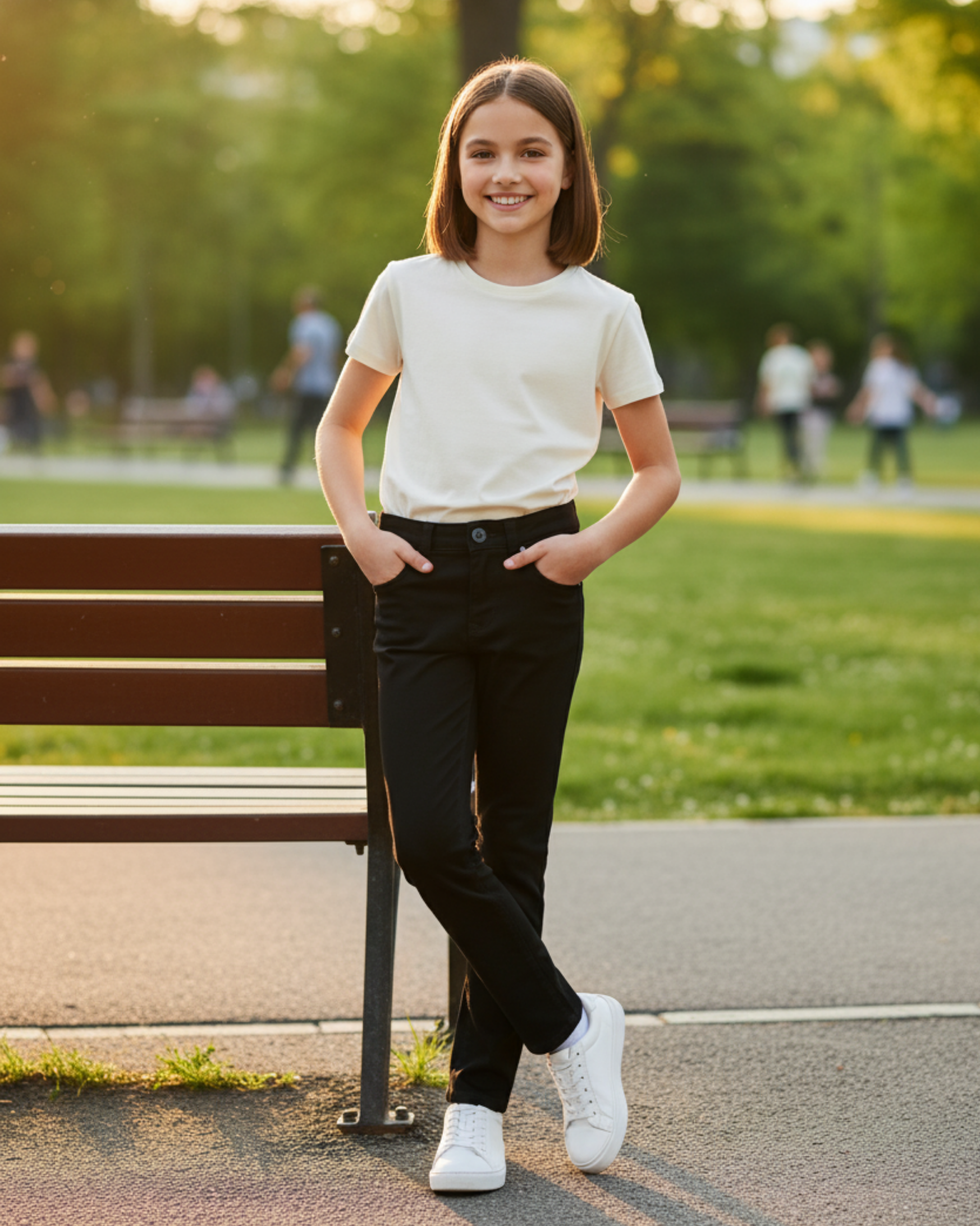 Este pantalón en color negro profundo es la pieza versátil y esencial que no puede faltar. Con un corte clásico y ligeramente ajustado que favorece, imita el estilo de un jean con sus cinco bolsillos, pero con un tejido que permite vestirlo de forma más formal o casual. Es el lienzo perfecto para cualquier outfit gracias a su color atemporal. Para un look pulido y moderno, combínalo con el jersey de cuello perkins negro y botines, o con una camiseta gráfica y una cazadora vaquera para un estilo casual de fin de semana.