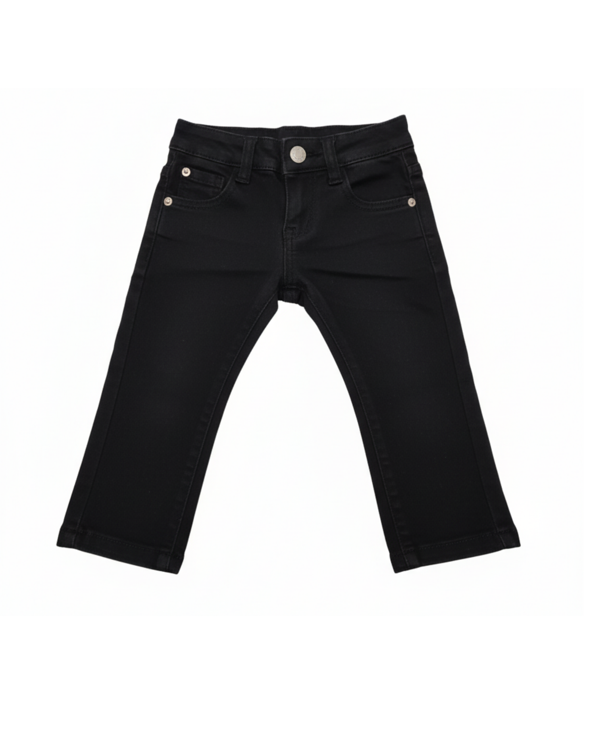 Pantalón de bebé tipo vaquero en color negro liso. Presenta un corte recto y un estilo clásico de cinco bolsillos. Incluye cierre de botón a presión y cremallera, ideal para un look casual y versátil.