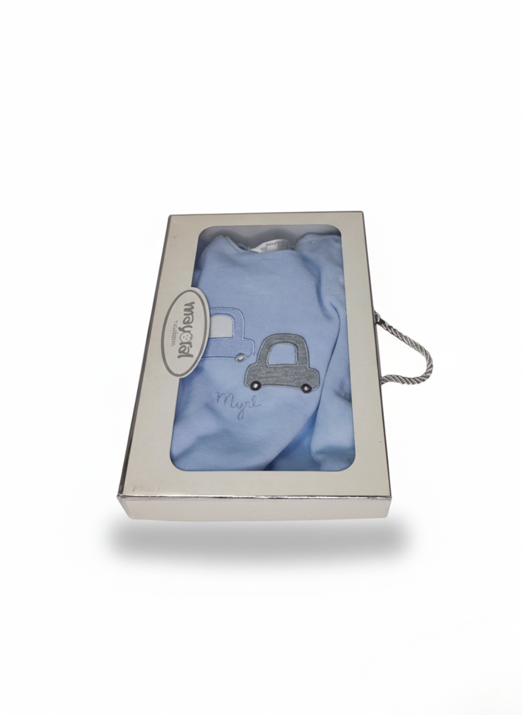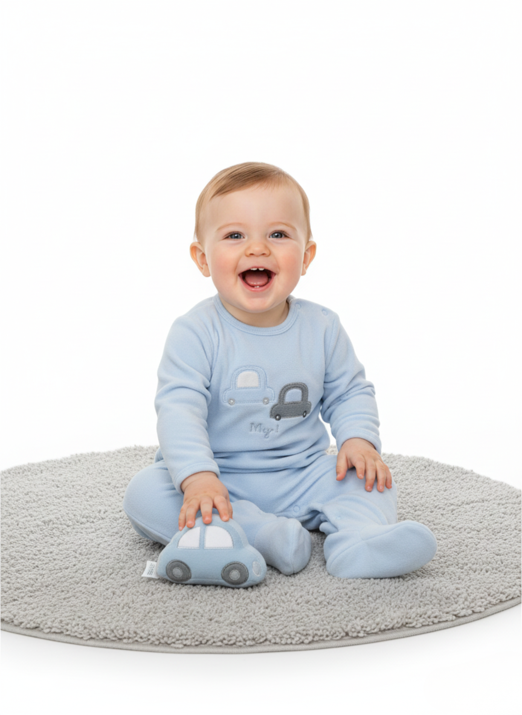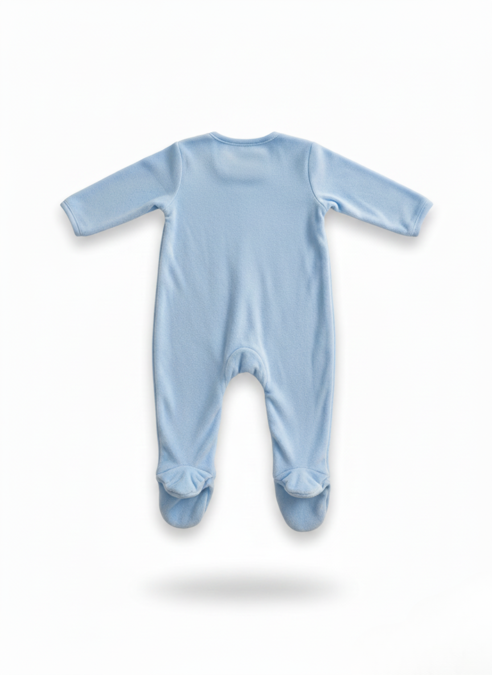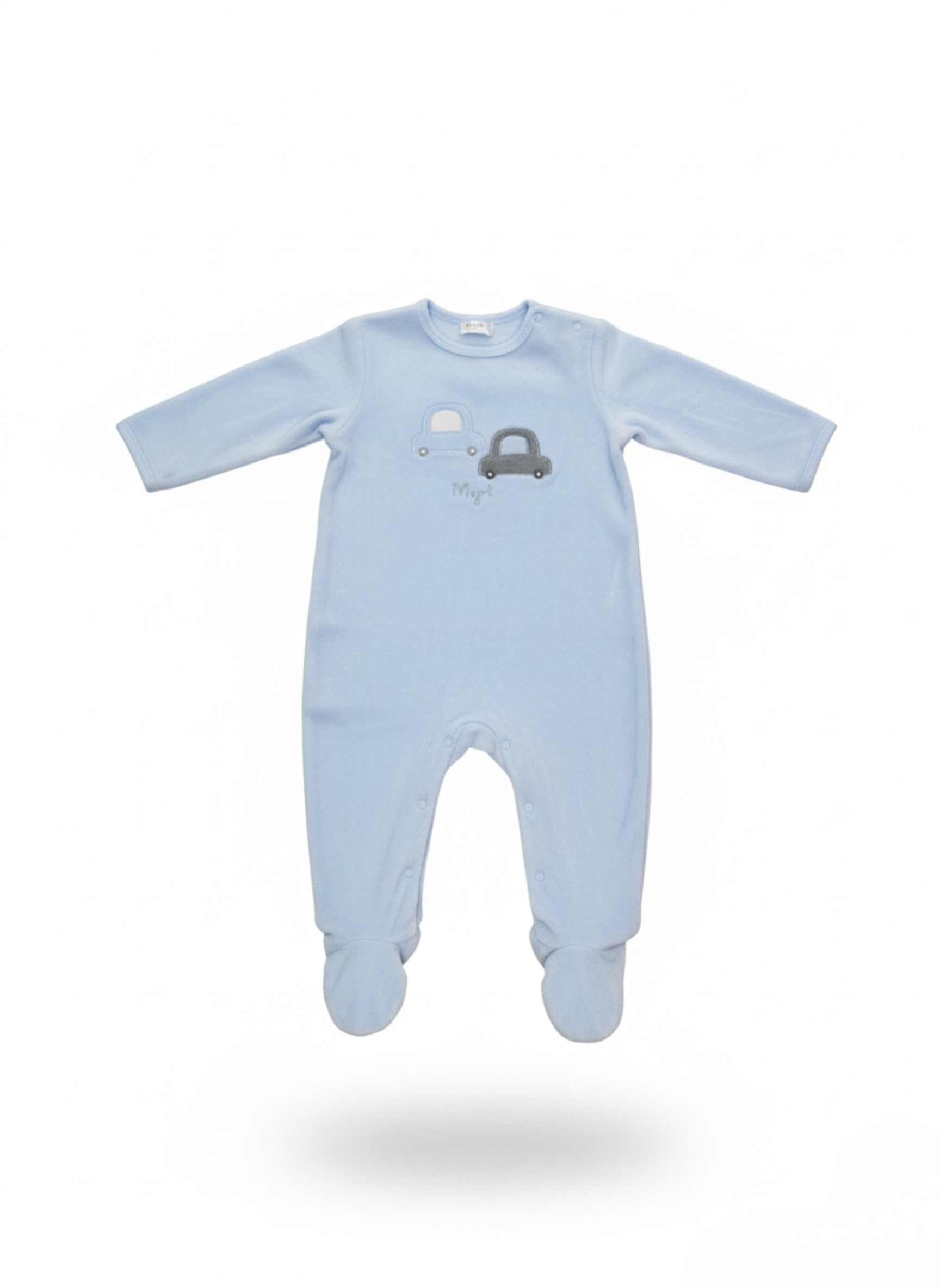 Este es un pelele de una sola pieza, de manga larga y con pie cubierto (polaina/calcetín) para bebé. Está confeccionado en un tejido de felpa suave de color azul celeste liso. El diseño incluye una aplicación de dos coches (uno azul claro y uno gris oscuro) en el pecho, y tiene botones de presión en la entrepierna y en el hombro.