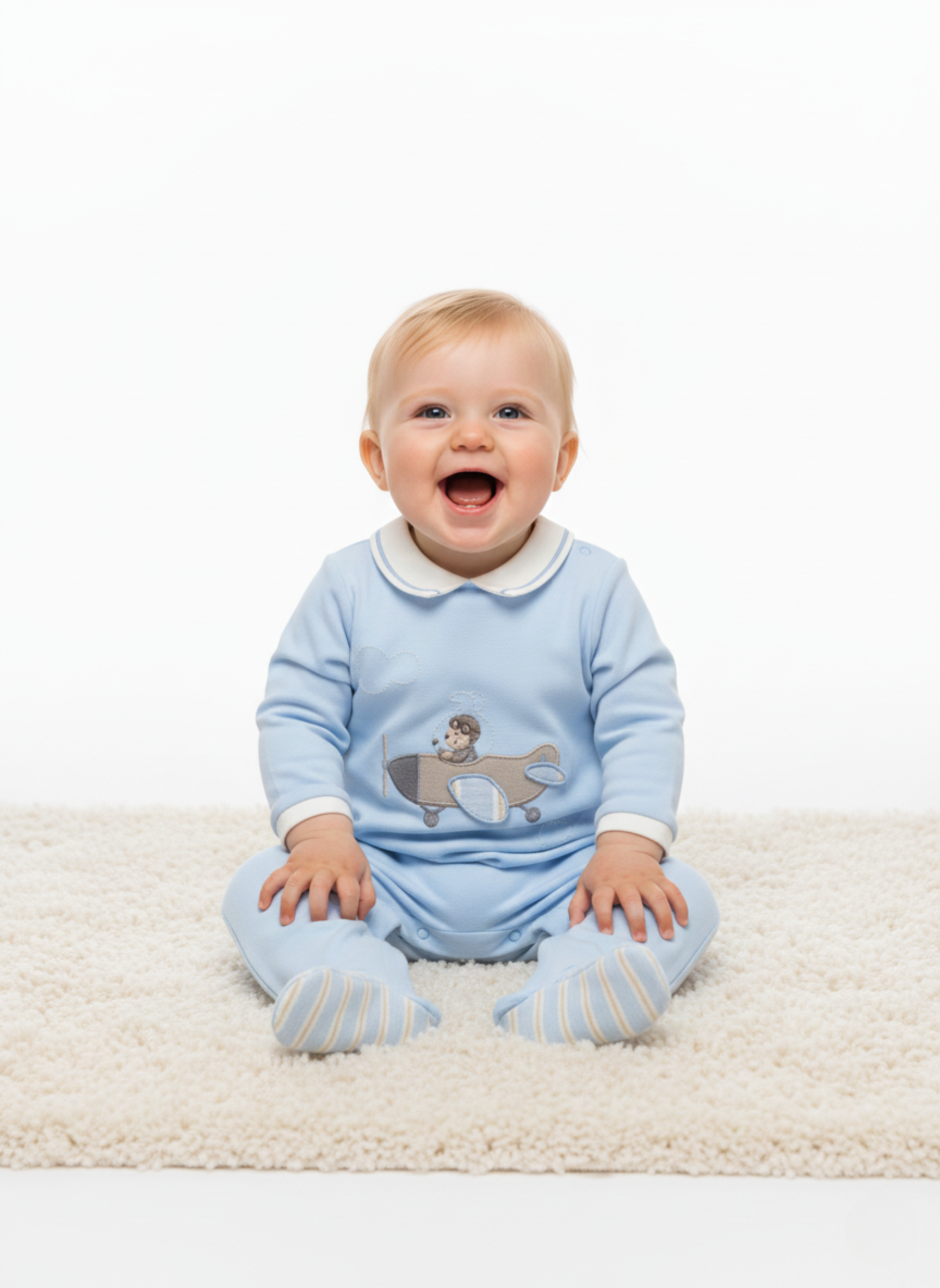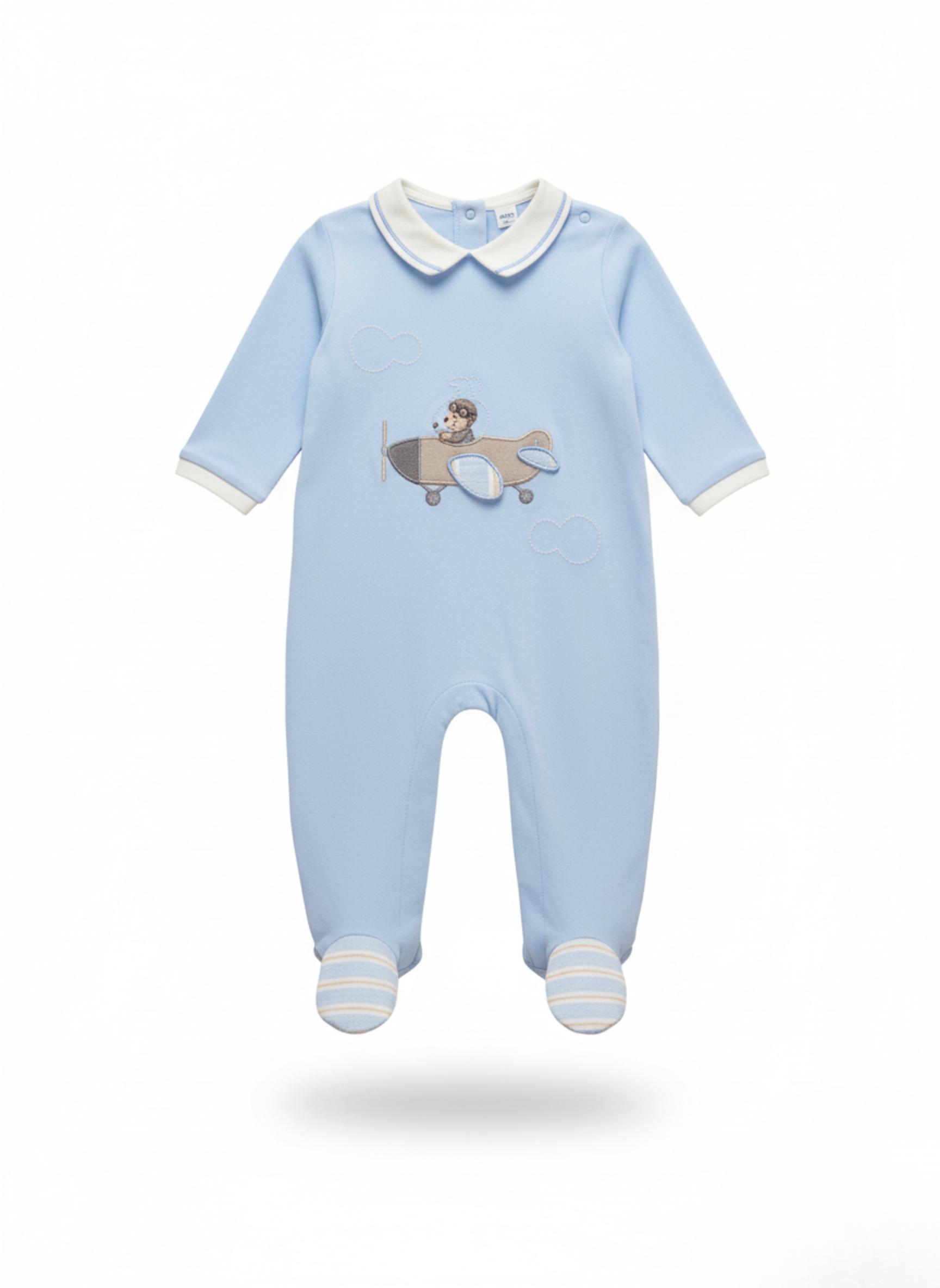 Este es un pelele de una sola pieza, de manga larga y con pie cubierto para bebé. Está confeccionado en un tejido de punto suave de color azul celeste liso. El diseño incluye un cuello Peter Pan de color blanco y crema, y una aplicación central de un bebé aviador volando en un avión de hélice, con nubes bordadas.