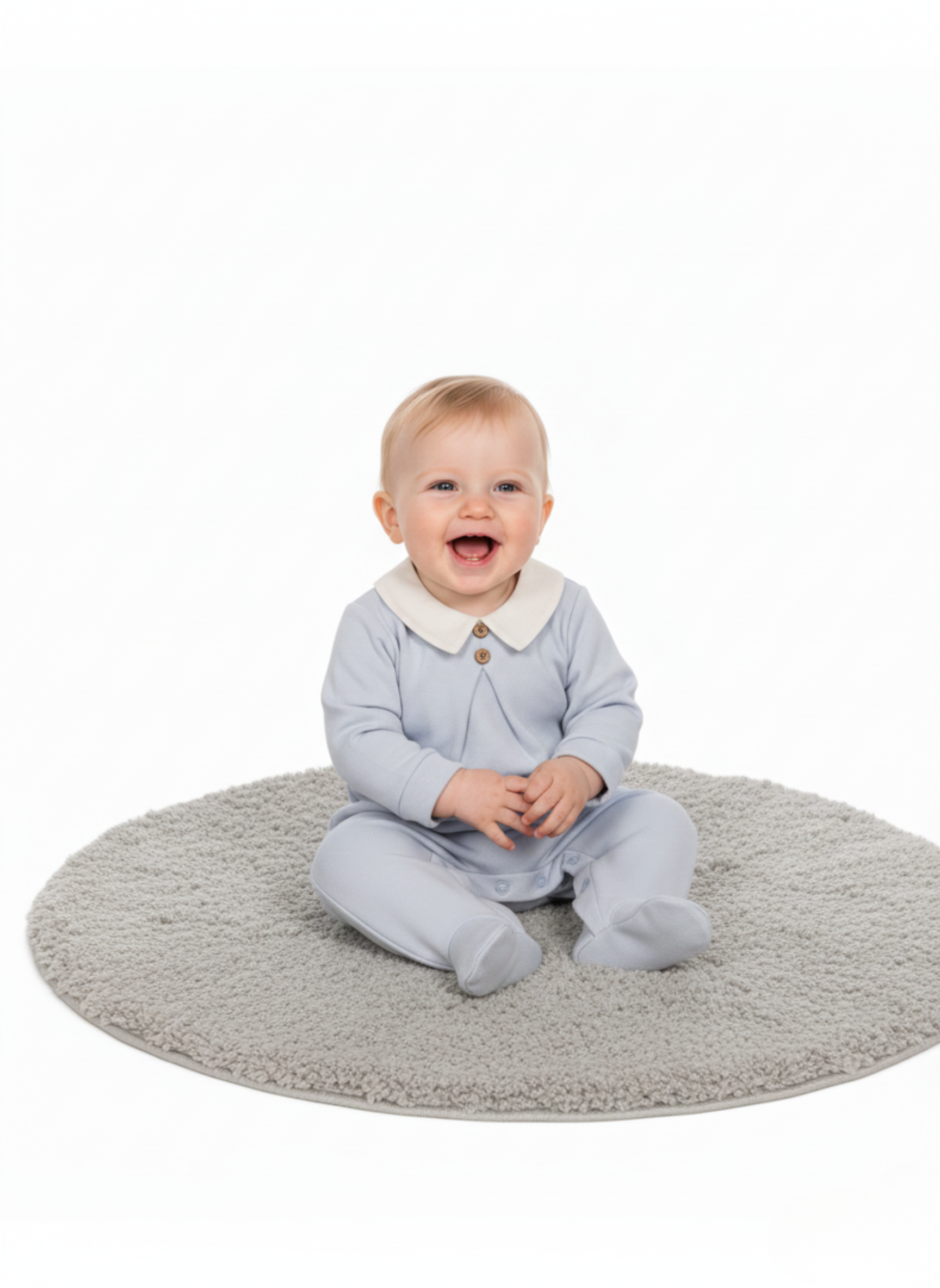 Este es un pelele de una sola pieza, de manga larga y con pie cubierto (polaina/calcetín) para bebé. Está confeccionado en un tejido suave de color azul celeste pálido. El diseño destaca por su cuello Peter Pan en un color de contraste crema/blanco, un frunce en la pechera con botones decorativos de madera, y botones de presión en la entrepierna. Ideal para el invierno; combínalo con un cárdigan de punto en tono gris o blanco roto, y una mantita de muselina suave para arropar al bebé.