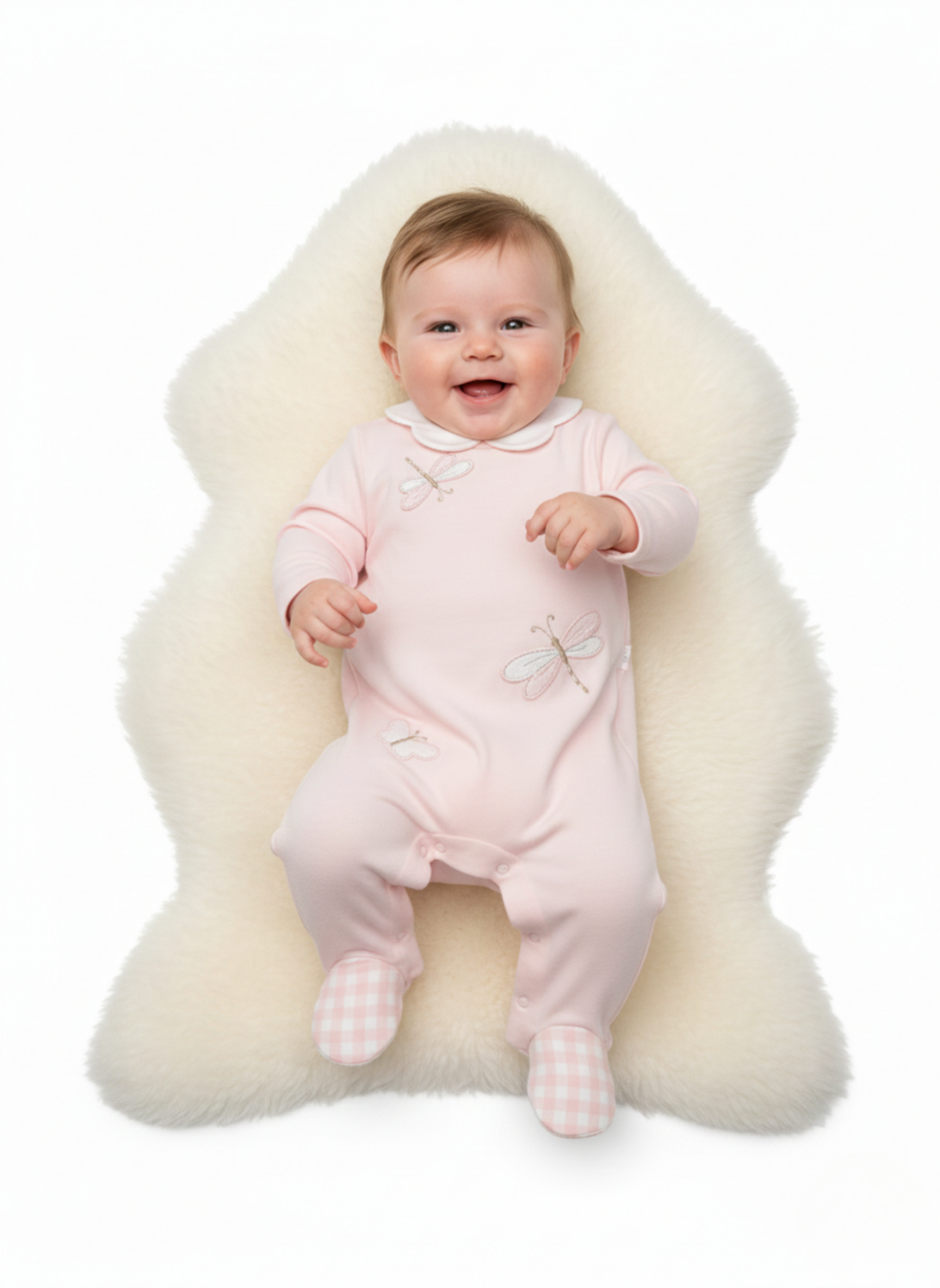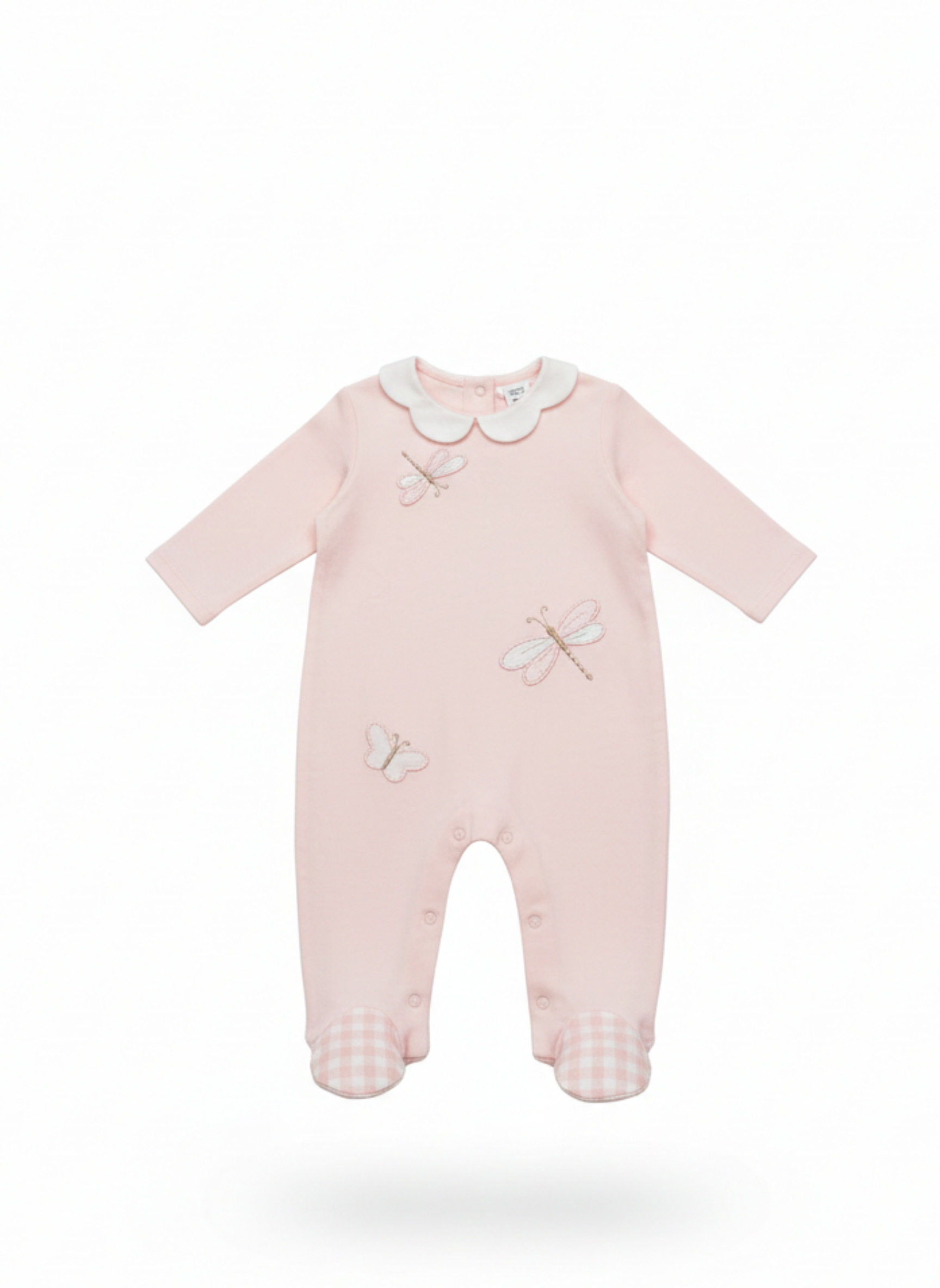 Este es un pelele de una sola pieza, de manga larga y con pie cubierto para bebé. Está confeccionado en un tejido de punto suave de color rosa pálido liso. Destaca por su cuello Peter Pan blanco con borde ondulado y las aplicaciones bordadas de libélulas y una mariposa en el frontal.