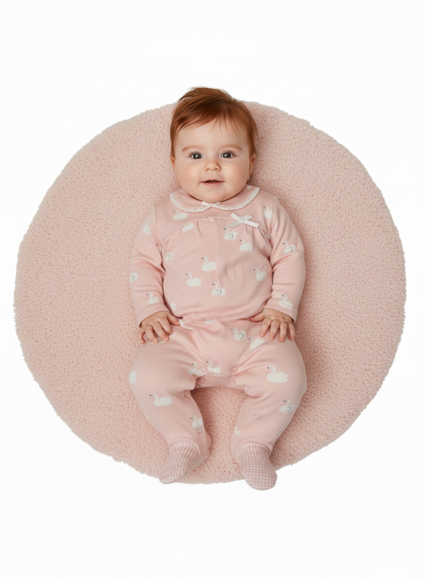 Este es un pelele de una sola pieza, de manga larga y con pie cubierto para bebé. Está confeccionado en un tejido de punto suave de color rosa pálido con un estampado integral de elegantes cisnes blancos. El diseño destaca por su cuello redondo con un fino ribete de encaje blanco y un pequeño lazo decorativo en la pechera. Cuenta con un cierre lateral y en la entrepierna mediante botones de presión para facilitar el cambio.