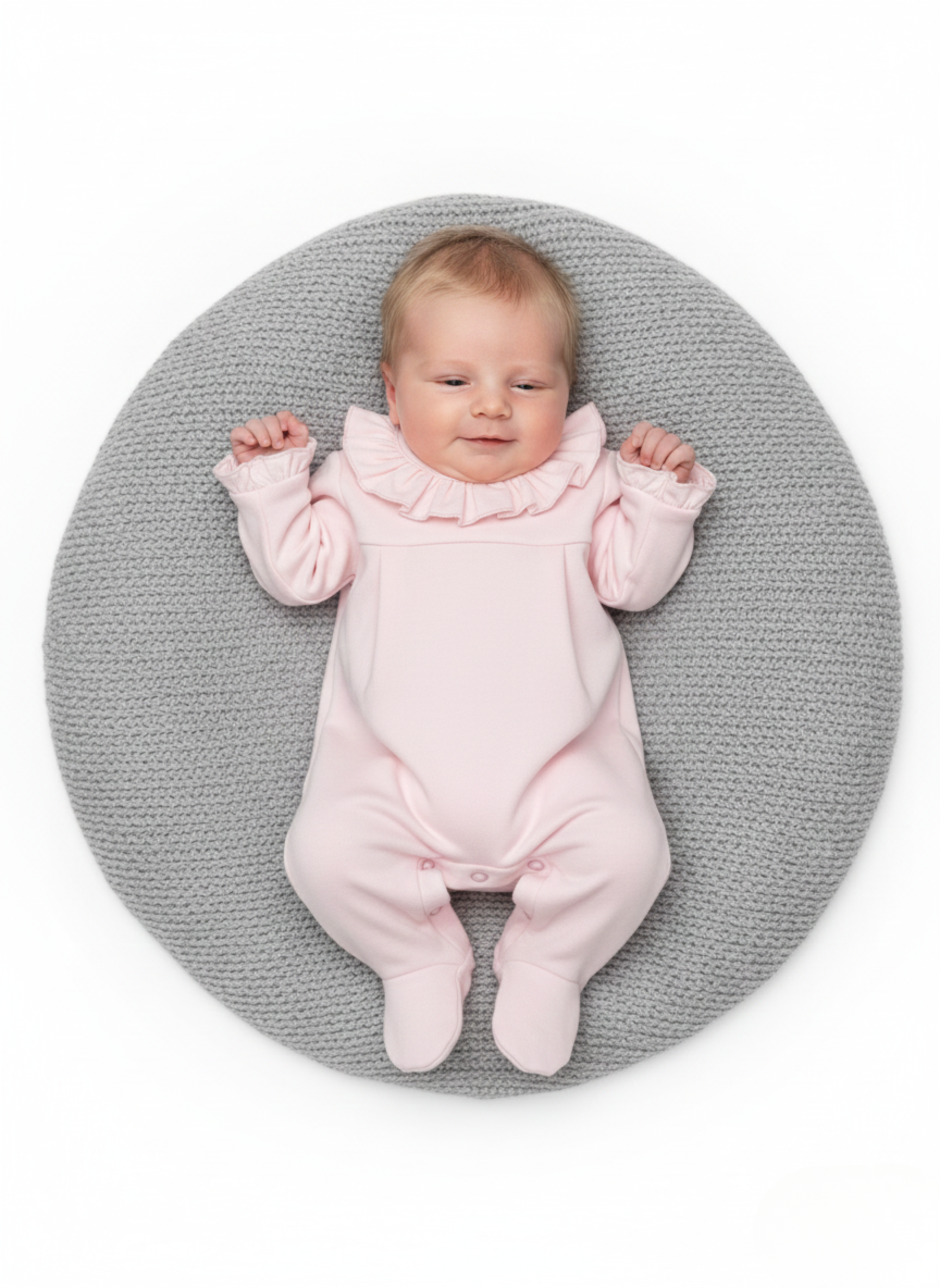 Este es un pelele de una sola pieza, de manga larga y con pie cubierto (polaina/calcetín) para bebé. Está confeccionado en un tejido suave de color rosa pastel liso. El diseño destaca por el gran volante fruncido que rodea el cuello, y tiene botones de presión en la entrepierna y en la espalda para facilitar el cambio. Ideal como prenda de base en invierno; combínalo con una chaqueta o cárdigan de punto en color gris claro o blanco crudo, y un gorrito de lana a juego.