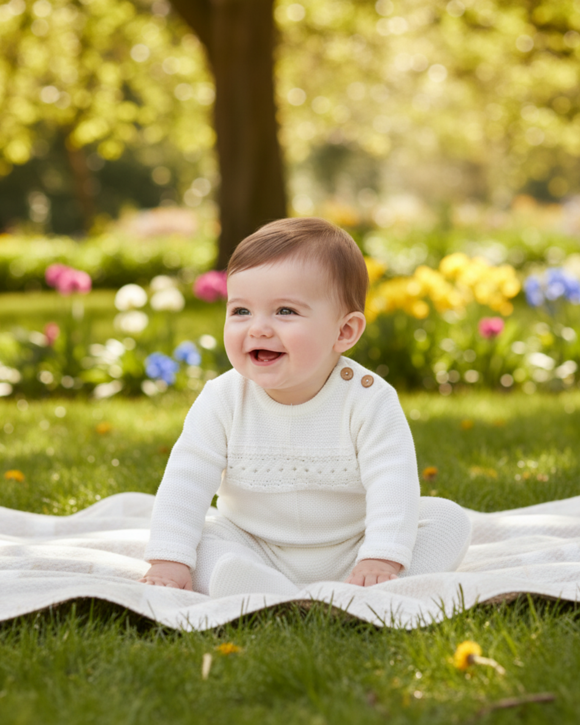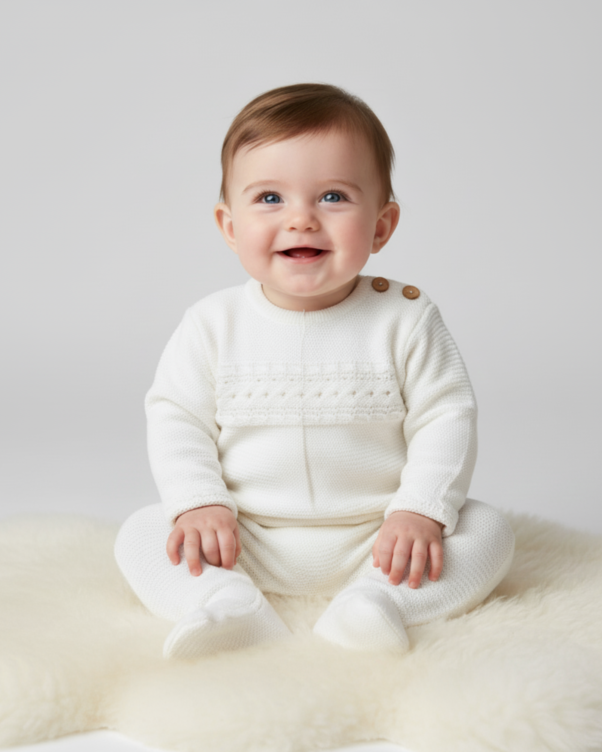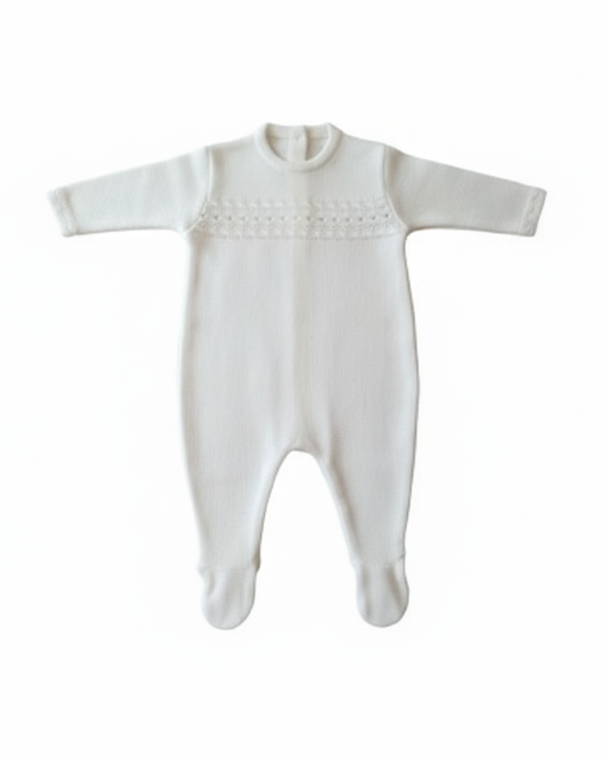 Este adorable pelele de punto en color blanco roto es la prenda ideal para envolver a tu bebé en suavidad y calidez. Presenta un elegante detalle de punto calado en el pecho que le da un toque clásico y delicado, y los pies cubiertos para mantener el calor. Su diseño de manga larga y su material suave lo hacen perfecto para dormir o para el día a día. Para un look de recién nacido atemporal, combínalo con un gorrito de punto del mismo color y unas manoplas para un confort total.