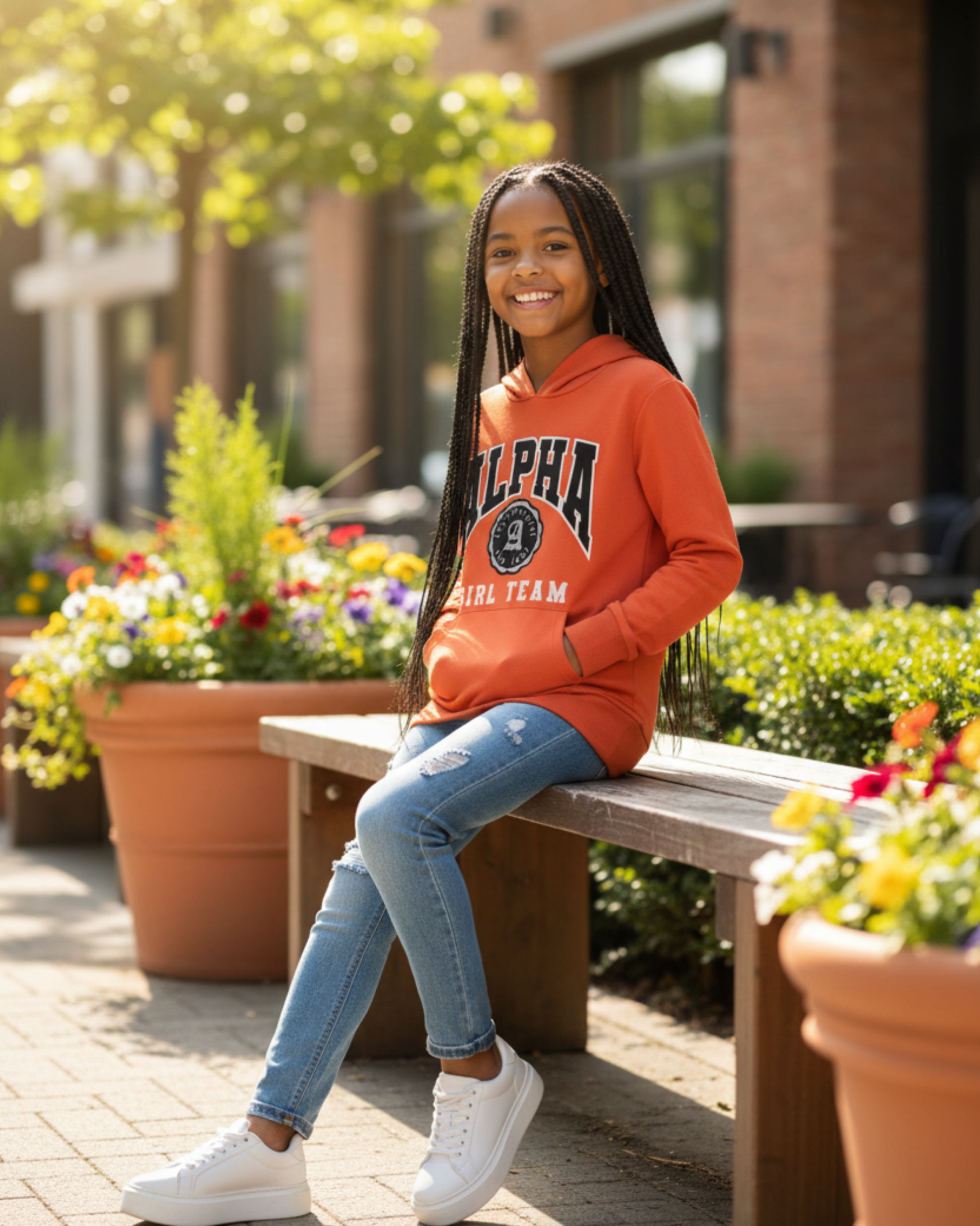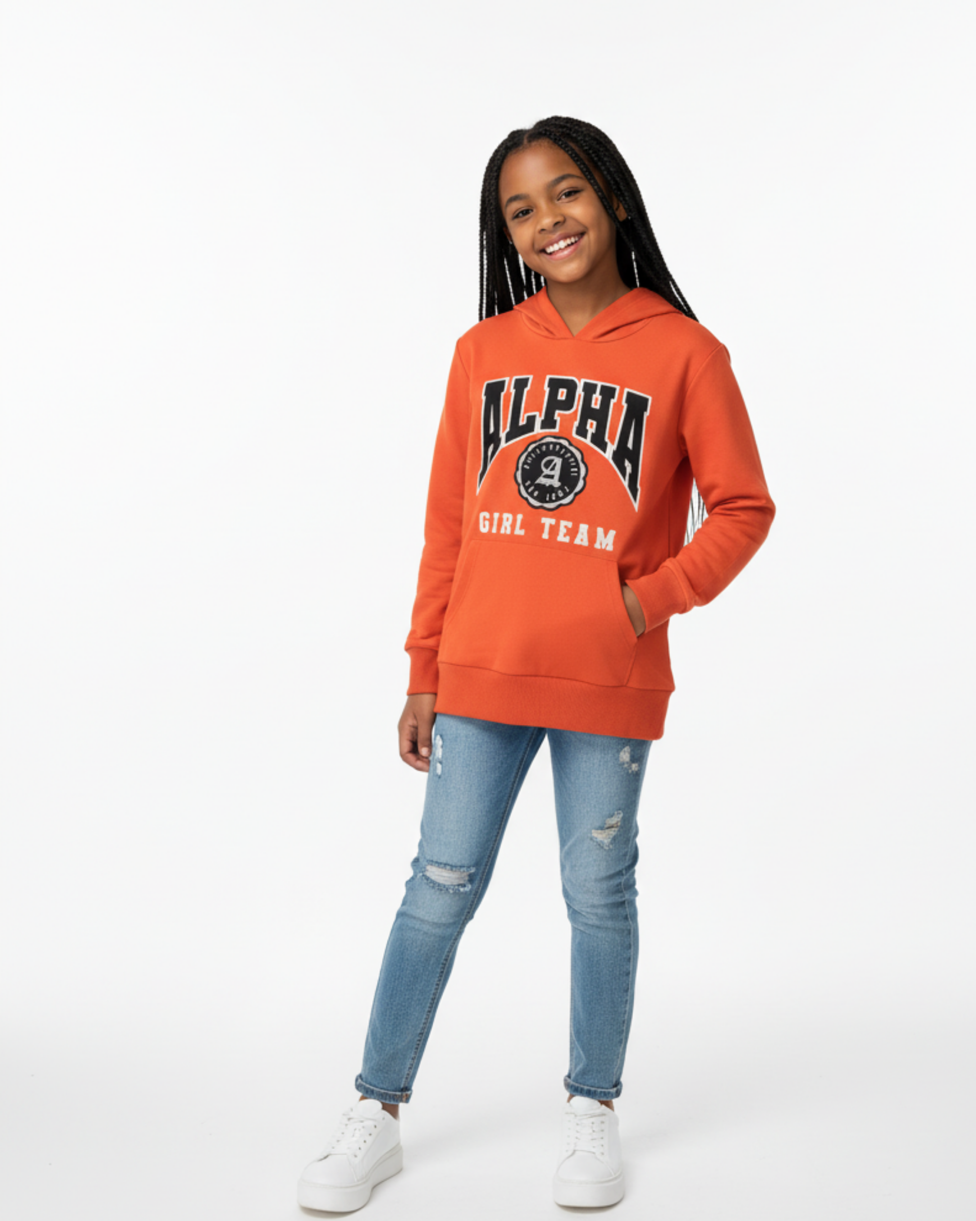 Sudadera con capucha en un vibrante color naranja, con un gran estampado frontal de estilo universitario que dice "ALPHA GIRL TEAM" en blanco y negro. Presenta puños y bajo acanalados y es ideal para un look deportivo y enérgico.